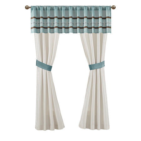 - Each curtain panel is 42x84 inches with coordinating tieback and valance