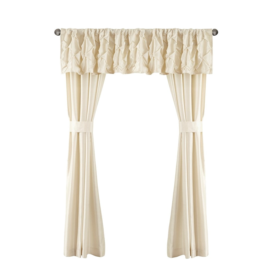 - Each curtain panel is 42x84 inches with coordinating tieback and valance