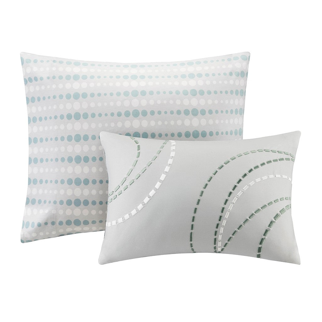 The Madison Park Essentials Knowles Complete Comforter and Cotton Sheet Set brings a clean, modern update to your bedroom. A geometric print of aqua, white, and light grey circles covers this soft microfiber comforter, for a refreshing allure. Matching shams (1 for Twin Sizes) repeat the design on the comforter, while a solid grey bed skirt and an embroidered decorative pillow provide the finishing touches. Also included is a complete cotton sheet set with a coordinating geometric print. Bringing the best in health and wellness, this bedding set also features an anti-microbial treatment that provides built-in freshness protection, reducing the growth of odor causing bacteria and keeps fabric lasting longer. This bedding set is also OEKO-TEX certified, meaning it does not contain any harmful substances or chemicals, ensuring quality comfort and wellness. This bedding set may come in rolled or compressed packing and will need to be fluffed up. Use a steam iron to help remove wrinkles easier.