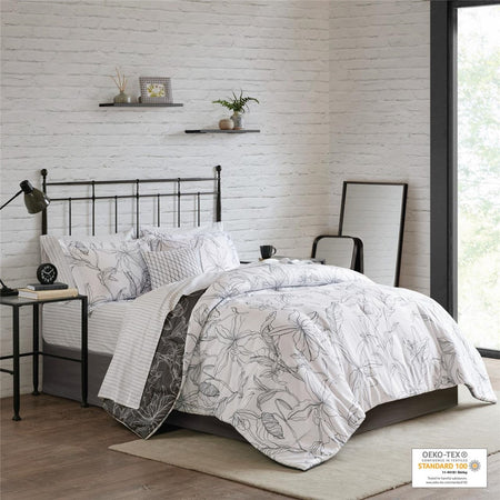 The Madison Park Essentials Lilia Reversible Complete Bedding Set with Cotton Sheet Set offers a modern update to your bedroom. The reversible comforter and shams (1 in Twin sizes) feature a botanic print in charcoal grey on a white base that flips the color scheme on the reverse. A solid grey bedskirt and a square decorative pillow with embroidered details add the perfect finishing touches. Also included is a striped 100% cotton sheet set that coordinates with the comforter set. Bringing the best in health and wellness, this bedding set also features an anti-microbial treatment that provides built-in freshness protection, reducing the growth of odor causing bacteria and keeps fabric lasting longer. This bedding set is also OEKO-TEX certified, meaning it does not contain any harmful substances or chemicals, ensuring quality comfort and wellness. This bedding set may come in rolled or compressed packing and will need to be fluffed up. Use a steam iron to help remove wrinkles easier.
