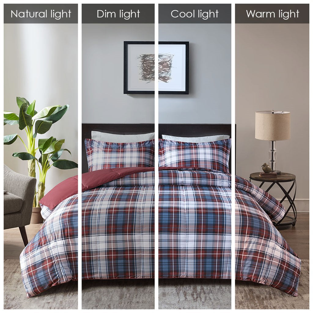 Sleep comfortably with the Madison Park Essentials Parkston 3M Scotchgard Down Alternative Comforter Mini Set. Sporting a cool plaid pattern, this ultra-soft comforter brings a classic casual style to your bedroom decor. The matching shams (1 in Twin/TwinXL) feature 2-inch flanges that add a charming touch to the top of the bed. A 3M Scotchgard Moisture Management Treatment helps wick away moisture to keep you cooler and drier for a comfortable night's sleep. This comforter set is OEKO-TEX certified with an antimicrobial treatment, meaning it does not contain any harmful substances or chemicals and reduces the risk of bacterial growth to ensure quality comfort and wellness. Items in the set may come in a rolled or compressed packaging, which will need to be fluffed up or steam ironed before use to remove wrinkles.