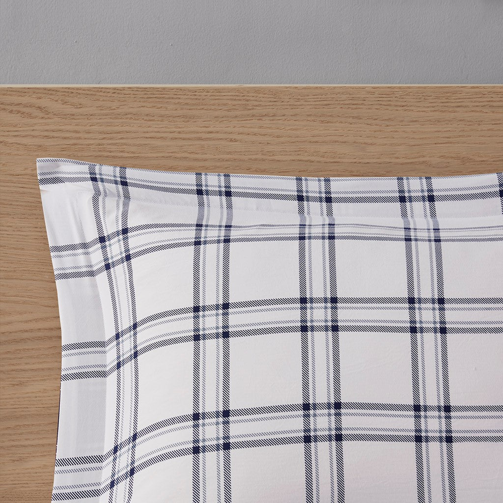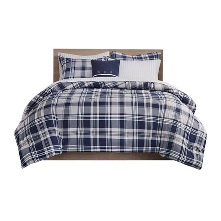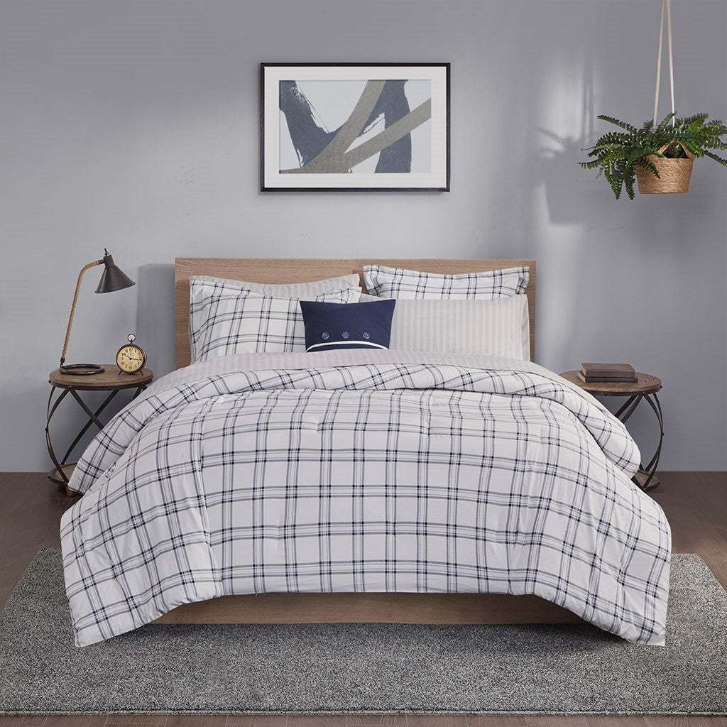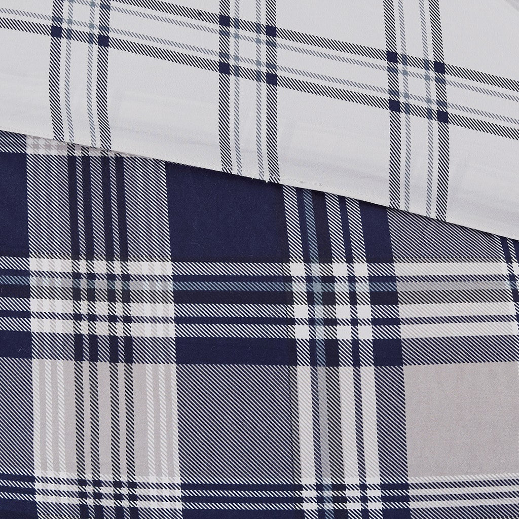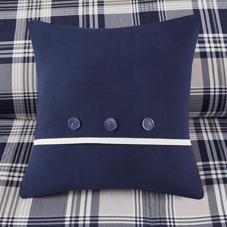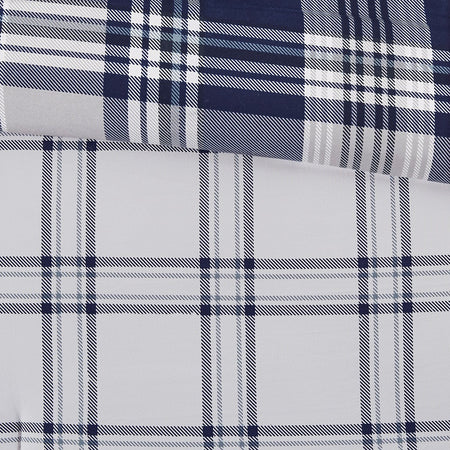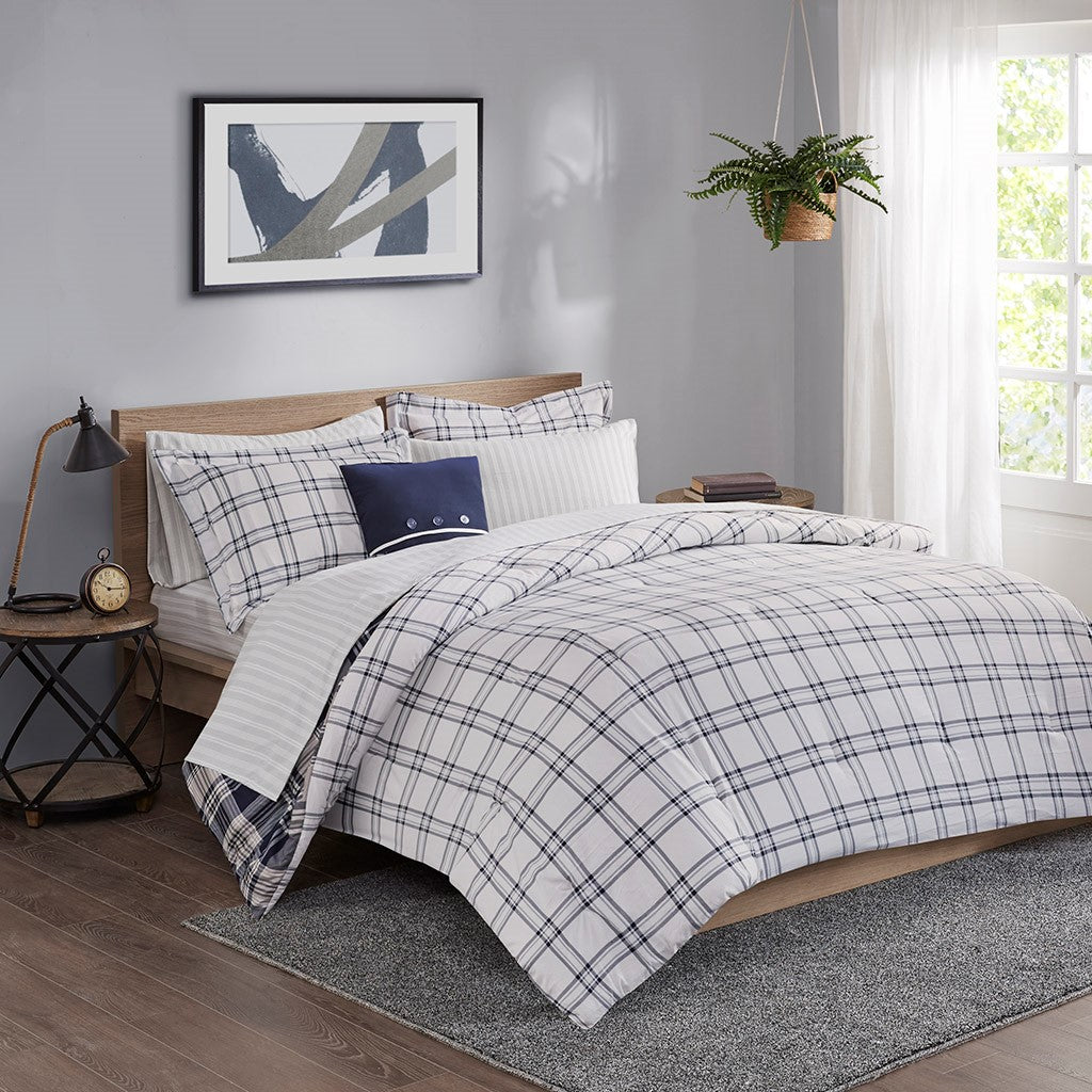 Restyle your bedroom with the Madison Park Essentials Patrick Reversible Comforter Set with Sheet Set. The reversible comforter and shams (1 in Twin Sizes) feature a navy plaid print on the face and a white plaid print on the reverse, for a charming casual look. A coordinating square decorative pillow adds a finishing touch to the comforter. Also included is a grey sheet set, complete with a flat sheet, fitted sheet, and 2 pillowcases (1 for Twin Sizes). Bringing the best in health and wellness, this bedding set also features an anti-microbial treatment that provides built-in freshness protection, reducing the growth of odor causing bacteria and keeps fabric lasting longer. This bedding set is also OEKO-TEX certified, meaning it does not contain any harmful substances or chemicals, ensuring quality comfort and wellness. This bedding set may come in rolled or compressed packing and will need to be fluffed up. Use a steam iron to help remove wrinkles easier.