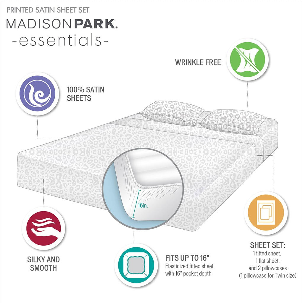 Treat yourself and your bedroom with the elegance of these luxury bed sheets. These wrinkle free satin sheets are silky smooth to the touch and feature a glamorous leopard animal print that elevates the style and comfort of your bed. Gentle on your skin and hair, this satin sheet set helps reduce damage causing friction, making it an essential part of your beauty self-care routine. Additional matching satin pillowcases are available and sold separately.