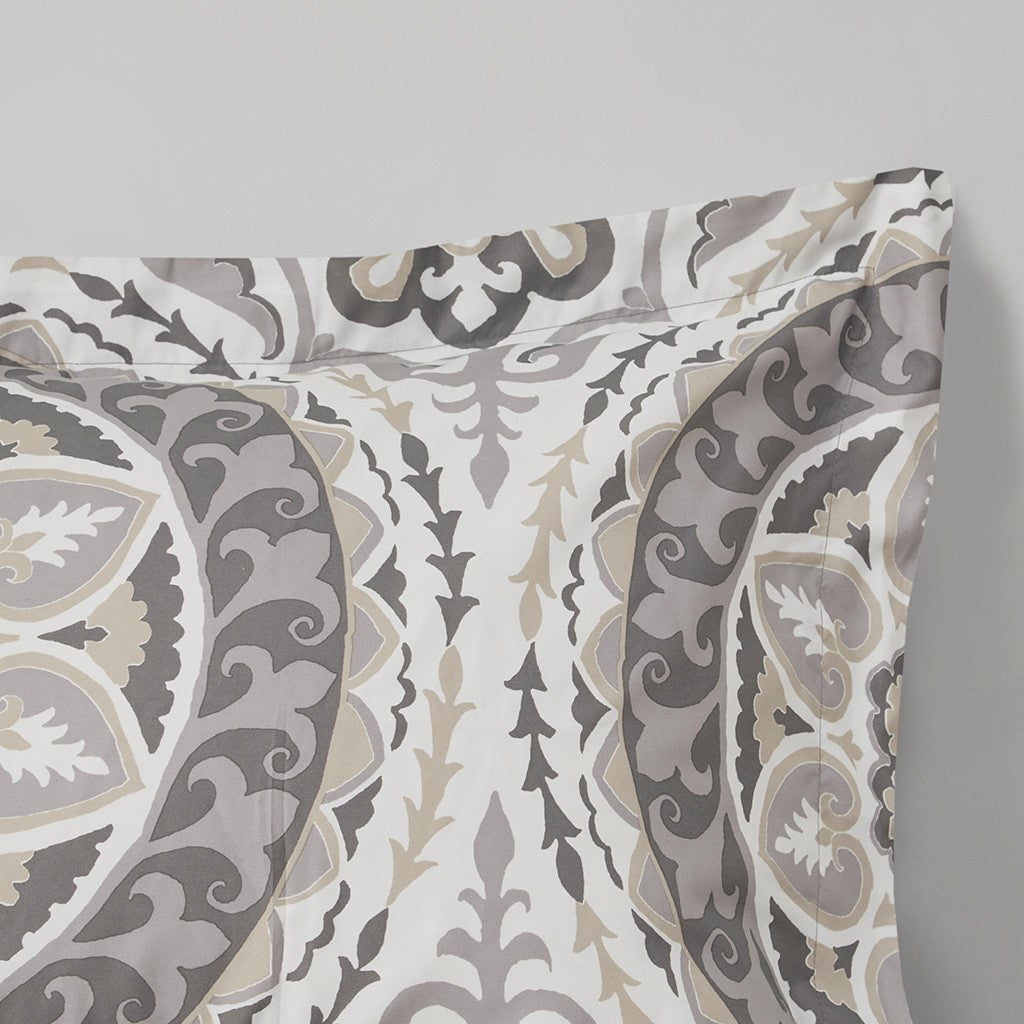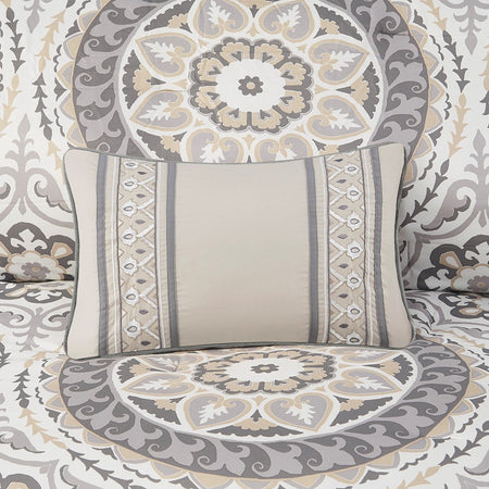 The Madison Park Essentials Serenity Complete Comforter and Cotton Sheet Set provides a fresh globally inspired look for your bedroom. An intricate medallion pattern repeats across the top of bed in brilliant shades of complementary colors to play up the oversized print. An oblong pillow uses decorative embroidery and piecing to create texture on the top of bed. Also included is a complete cotton sheet set that features a coordinating medallion print to complete the look. Bringing the best in health and wellness, this bedding set also features an anti-microbial treatment that provides built-in freshness protection, reducing the growth of odor causing bacteria and keeps fabric lasting longer. This bedding set is also OEKO-TEX certified, meaning it does not contain any harmful substances or chemicals, ensuring quality comfort and wellness. This bedding set may come in rolled or compressed packing and will need to be fluffed up. Use a steam iron to help remove wrinkles easier.