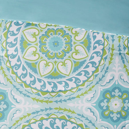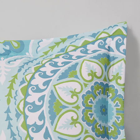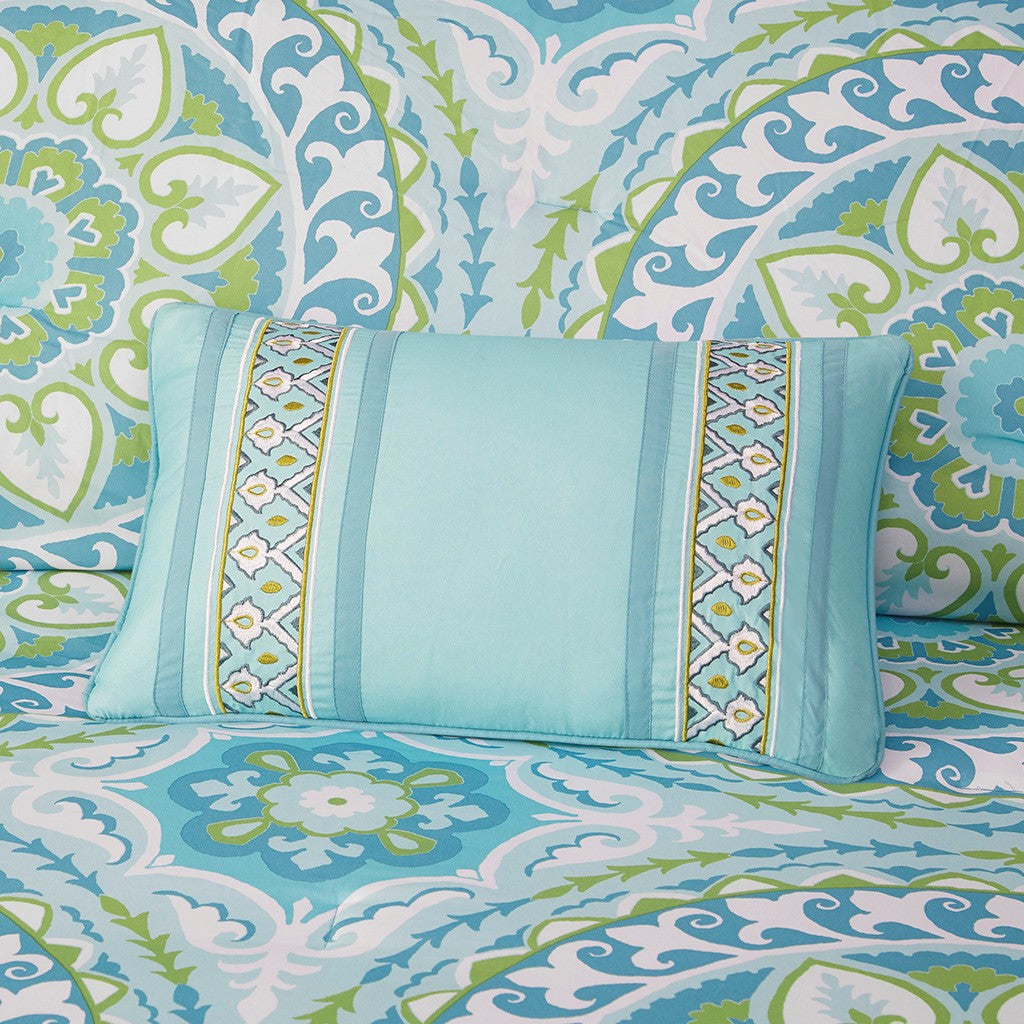 The Madison Park Essentials Serenity Complete Comforter and Cotton Sheet Set provides a fresh globally inspired look for your bedroom. An intricate medallion pattern repeats across the top of bed in brilliant shades of complementary colors to play up the oversized print. An oblong pillow uses decorative embroidery and piecing to create texture on the top of bed. Also included is a complete cotton sheet set that features a coordinating medallion print to complete the look. Bringing the best in health and wellness, this bedding set also features an anti-microbial treatment that provides built-in freshness protection, reducing the growth of odor causing bacteria and keeps fabric lasting longer. This bedding set is also OEKO-TEX certified, meaning it does not contain any harmful substances or chemicals, ensuring quality comfort and wellness. This bedding set may come in rolled or compressed packing and will need to be fluffed up. Use a steam iron to help remove wrinkles easier.