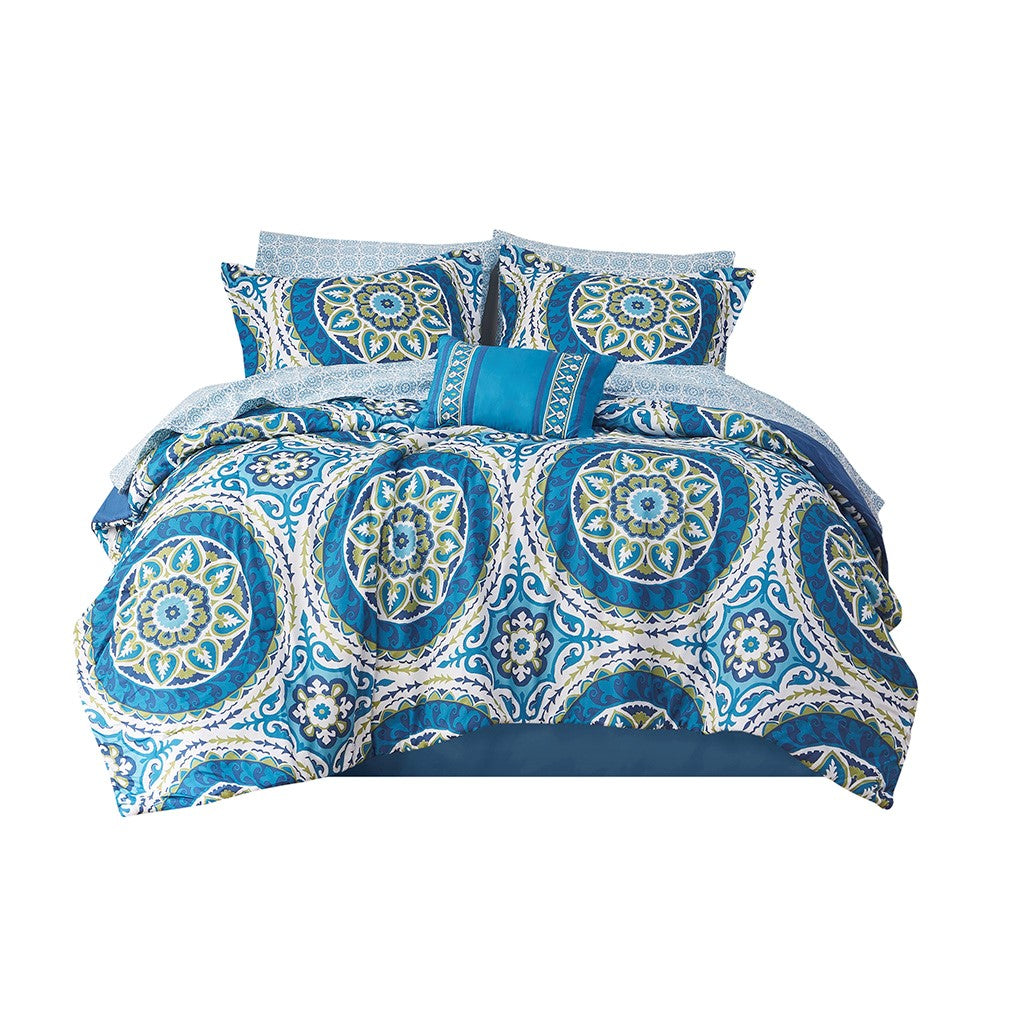 The Madison Park Essentials Serenity Complete Comforter and Cotton Sheet Set provides a fresh globally inspired look for your bedroom. An intricate medallion pattern repeats across the top of bed in brilliant shades of complementary colors to play up the oversized print. An oblong pillow uses decorative embroidery and piecing to create texture on the top of bed. Also included is a complete cotton sheet set that features a coordinating medallion print to complete the look. Bringing the best in health and wellness, this bedding set also features an anti-microbial treatment that provides built-in freshness protection, reducing the growth of odor causing bacteria and keeps fabric lasting longer. This bedding set is also OEKO-TEX certified, meaning it does not contain any harmful substances or chemicals, ensuring quality comfort and wellness. This bedding set may come in rolled or compressed packing and will need to be fluffed up. Use a steam iron to help remove wrinkles easier.