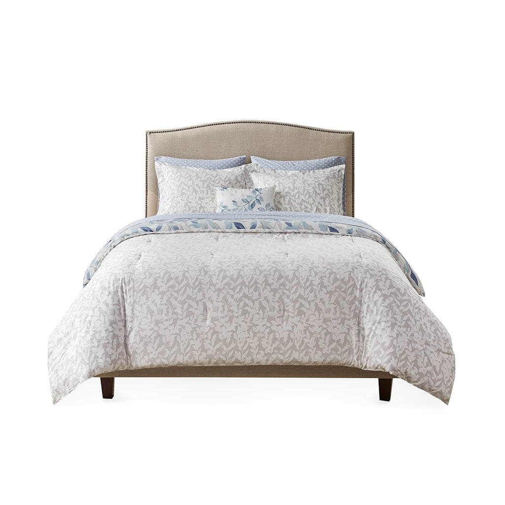 The Madison Park Essentials Sofia Reversible Comforter Set with Sheet Set offers a beautiful update for your entire bed. A botanical print, in soft blue hues, adorns the face and the reverse of comforter, creating two distinct and stylish looks. The matching reversible shams (1 in Twin Sizes) coordinate perfectly with the comforter, while an oblong decorative pillow adds the finishing touch. Also included is a patterned blue sheet set that completes this reversible bedding set. Bringing the best in health and wellness, this bedding set also features an anti-microbial treatment that provides built-in freshness protection, reducing the growth of odor causing bacteria and keeps fabric lasting longer. This bedding set is also OEKO-TEX certified, meaning it does not contain any harmful substances or chemicals, ensuring quality comfort and wellness. This bedding set may come in rolled or compressed packing and will need to be fluffed up. Use a steam iron to help remove wrinkles easier.