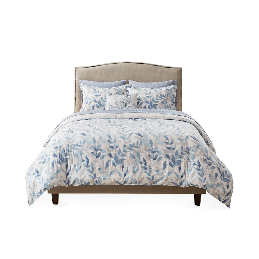The Madison Park Essentials Sofia Reversible Comforter Set with Sheet Set offers a beautiful update for your entire bed. A botanical print, in soft blue hues, adorns the face and the reverse of comforter, creating two distinct and stylish looks. The matching reversible shams (1 in Twin Sizes) coordinate perfectly with the comforter, while an oblong decorative pillow adds the finishing touch. Also included is a patterned blue sheet set that completes this reversible bedding set. Bringing the best in health and wellness, this bedding set also features an anti-microbial treatment that provides built-in freshness protection, reducing the growth of odor causing bacteria and keeps fabric lasting longer. This bedding set is also OEKO-TEX certified, meaning it does not contain any harmful substances or chemicals, ensuring quality comfort and wellness. This bedding set may come in rolled or compressed packing and will need to be fluffed up. Use a steam iron to help remove wrinkles easier.