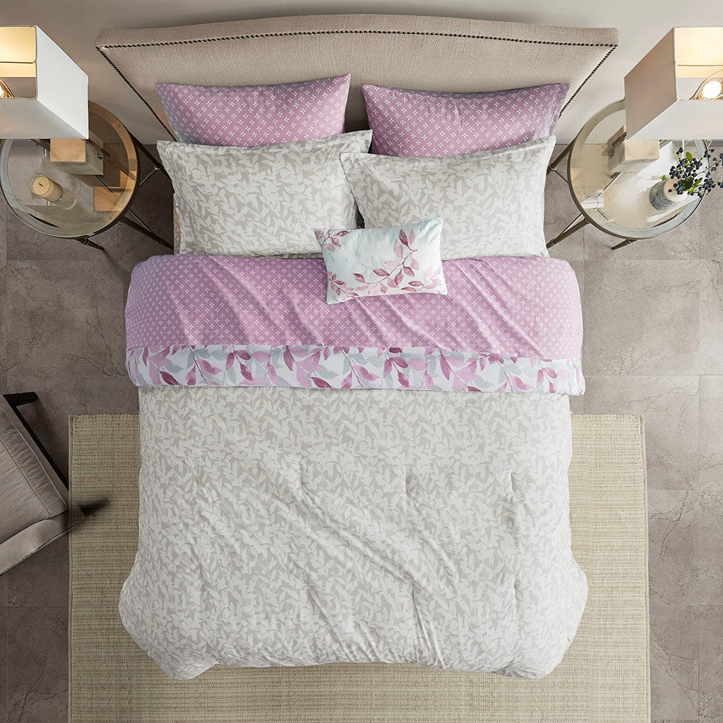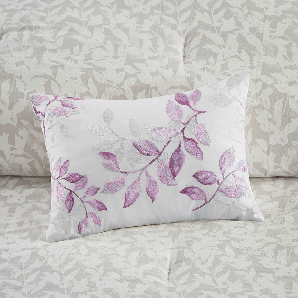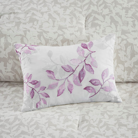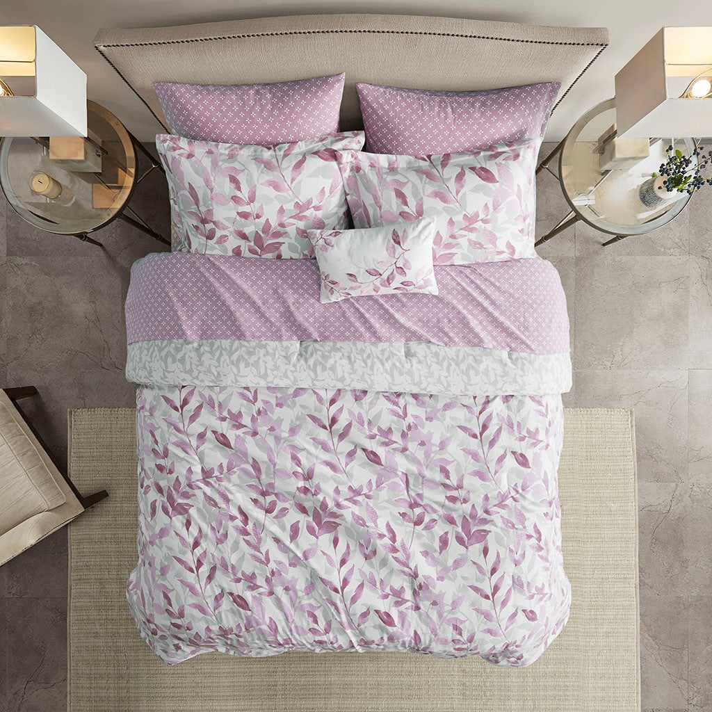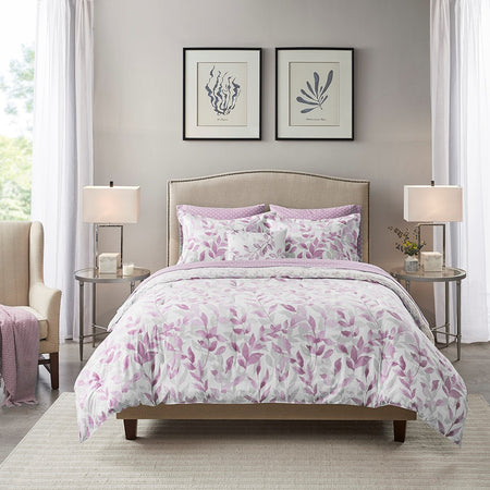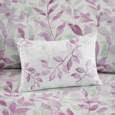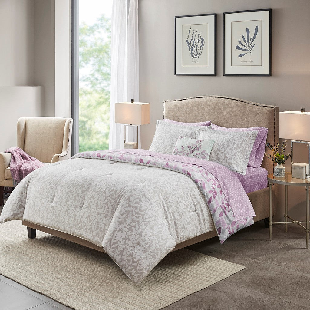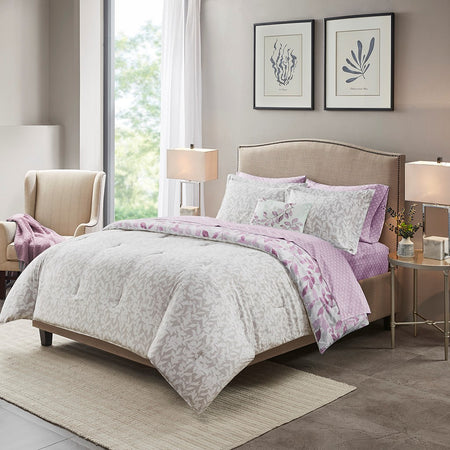The Madison Park Essentials Sofia Reversible Comforter Set with Sheet Set offers a beautiful update for your entire bed. A botanical print, in soft purple hues, adorns the face and the reverse of comforter, creating two distinct and stylish looks. The matching reversible shams (1 in Twin Sizes) coordinate perfectly with the comforter, while an oblong decorative pillow adds the finishing touch. Also included is a patterned purple sheet set that completes this reversible bedding set. Bringing the best in health and wellness, this bedding set also features an anti-microbial treatment that provides built-in freshness protection, reducing the growth of odor causing bacteria and keeps fabric lasting longer. This bedding set is also OEKO-TEX certified, meaning it does not contain any harmful substances or chemicals, ensuring quality comfort and wellness. This bedding set may come in rolled or compressed packing and will need to be fluffed up. Use a steam iron to help remove wrinkles easier.