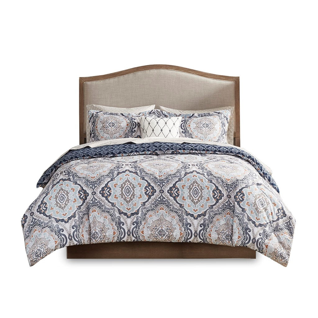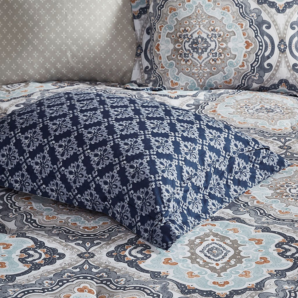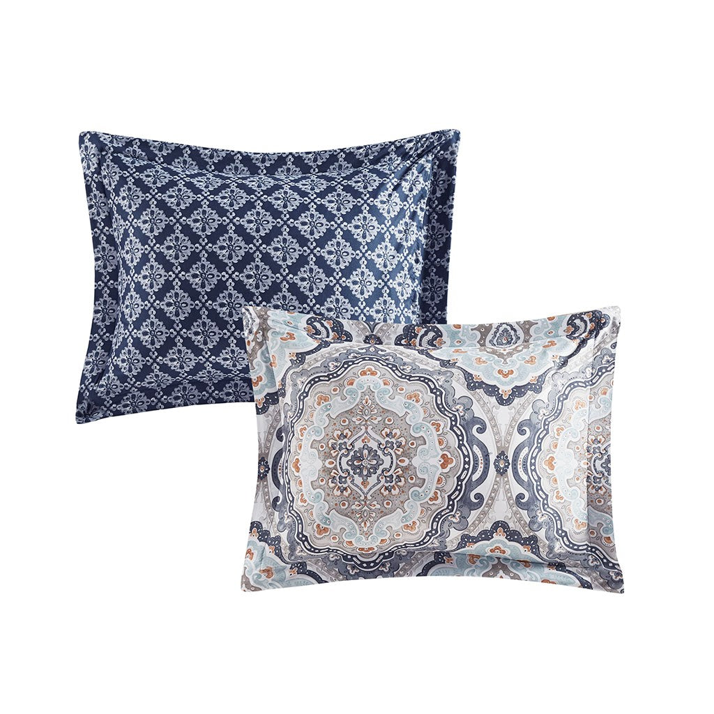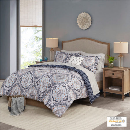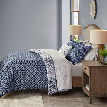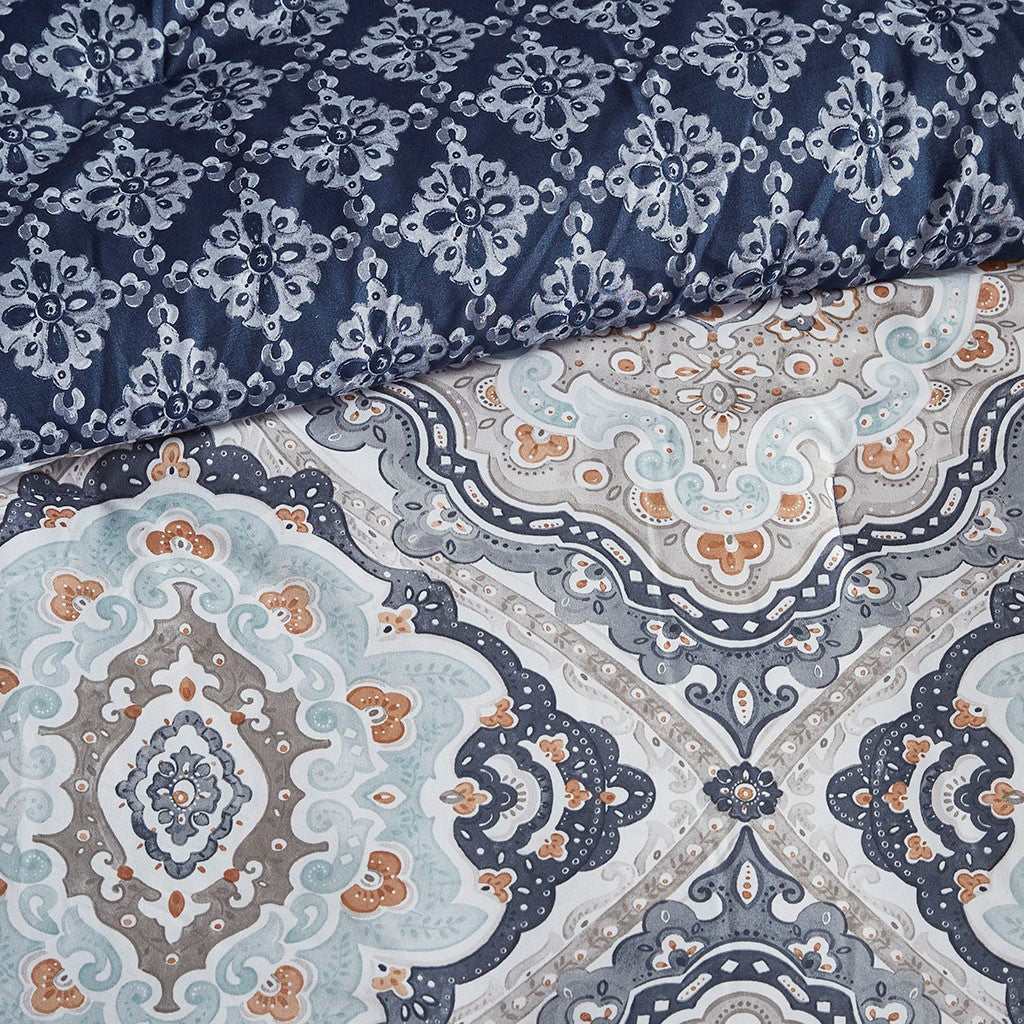 The Madison Park Essentials Titus Reversible Comforter Set with Sheet Set provides a beautiful contemporary update to your bedroom decor. An elegant damask pattern, in navy and white hues, adorns the soft microfiber face of the comforter. A smaller medallion print is displayed on the reverse for two stylish globally inspired looks. Matching shams (1 in Twin Sizes) complement the top of the bed and a diamond embroidered square decorative pillow adds a finishing touch. Also included is a complete microfiber sheet set. Bringing the best in health and wellness, this bedding set also features an anti-microbial treatment that provides built-in freshness protection, reducing the growth of odor causing bacteria and keeps fabric lasting longer. Machine washable for easy care, this reversible bedding set is OEKO-TEX certified, meaning it does not contain any harmful substances or chemicals, ensuring quality comfort and wellness. This bedding set may come in rolled or compressed packing and will need to be fluffed up. Use a steam iron to help remove wrinkles easier.