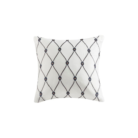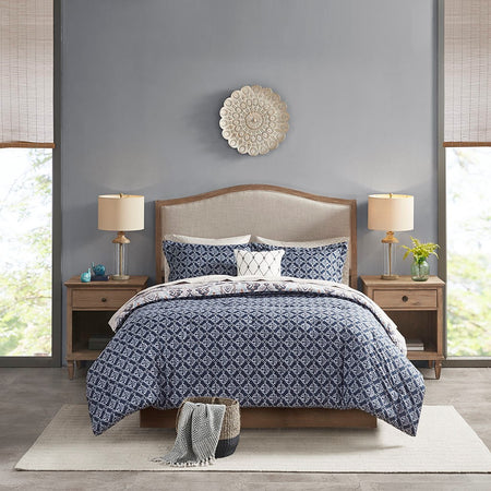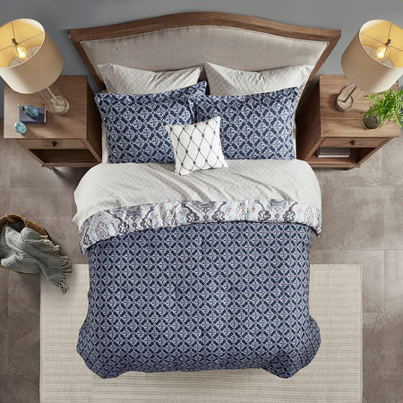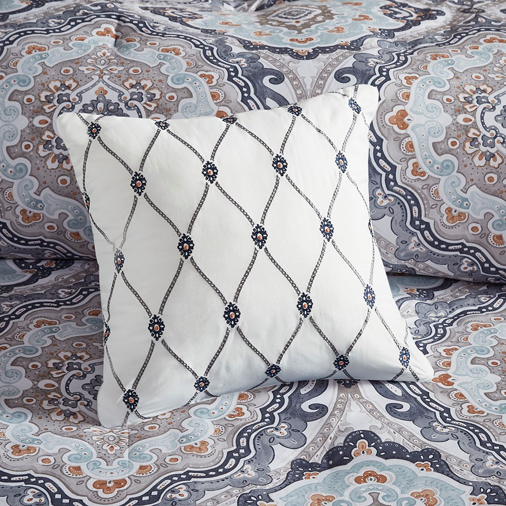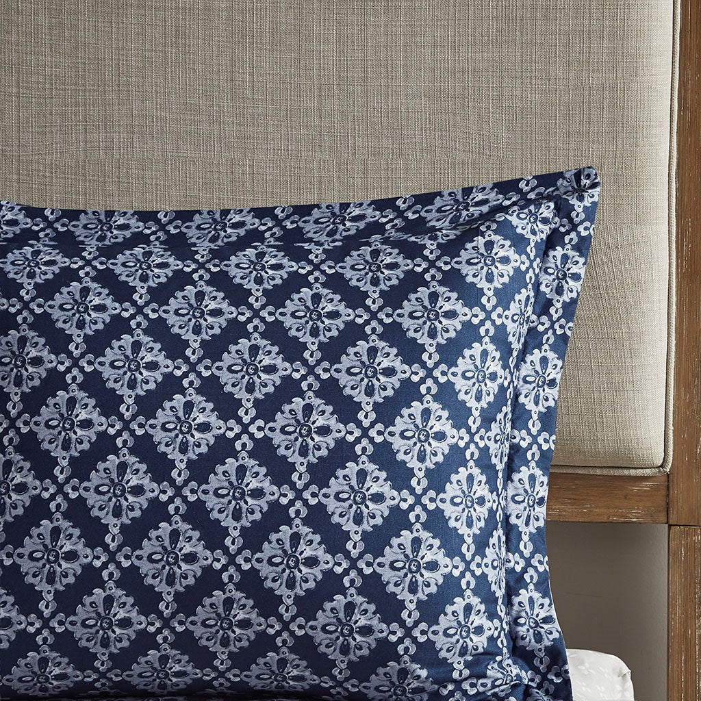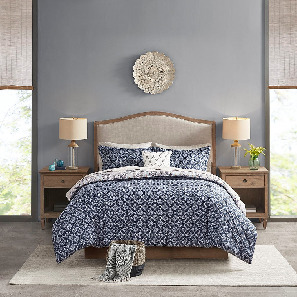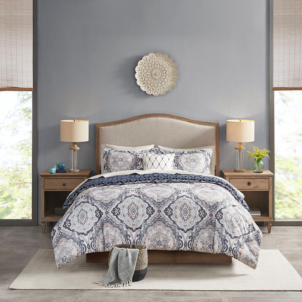 The Madison Park Essentials Titus Reversible Comforter Set with Sheet Set provides a beautiful contemporary update to your bedroom decor. An elegant damask pattern, in navy and white hues, adorns the soft microfiber face of the comforter. A smaller medallion print is displayed on the reverse for two stylish globally inspired looks. Matching shams (1 in Twin Sizes) complement the top of the bed and a diamond embroidered square decorative pillow adds a finishing touch. Also included is a complete microfiber sheet set. Bringing the best in health and wellness, this bedding set also features an anti-microbial treatment that provides built-in freshness protection, reducing the growth of odor causing bacteria and keeps fabric lasting longer. Machine washable for easy care, this reversible bedding set is OEKO-TEX certified, meaning it does not contain any harmful substances or chemicals, ensuring quality comfort and wellness. This bedding set may come in rolled or compressed packing and will need to be fluffed up. Use a steam iron to help remove wrinkles easier.