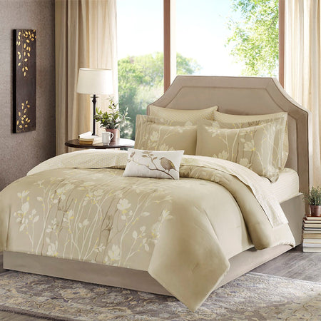 Madison Park Essentials Vaughn Complete Comforter and Cotton Sheet Set brings luxury and beauty to any bedroom. This taupe comforter is covered in elegant white and brown floral tree branches with subtle yellow details. This complete bed set includes matching shams, one decorative white pillow which features a beautiful bird applique in gold, a bed skirt, and a yellow and white geometric sheet set to complete the look. Bringing the best in health and wellness, this bedding set also features an anti-microbial treatment that provides built-in freshness protection, reducing the growth of odor causing bacteria and keeps fabric lasting longer. Machine washable for easy care, this complete bed and sheet set provides a complete makeover for your bedroom decor. This bedding set may come in rolled or compressed packing and will need to be fluffed up. Use a steam iron to help remove wrinkles easier.
