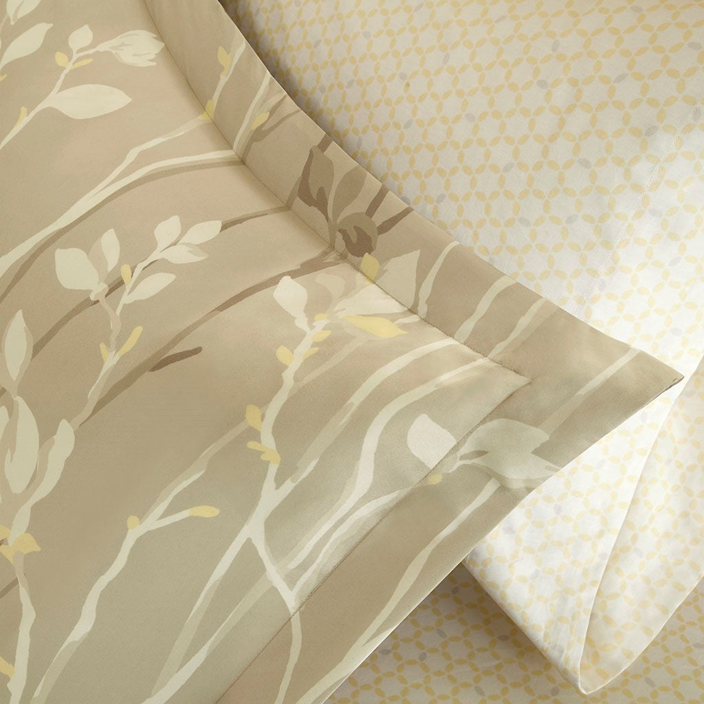 Madison Park Essentials Vaughn Complete Comforter and Cotton Sheet Set brings luxury and beauty to any bedroom. This taupe comforter is covered in elegant white and brown floral tree branches with subtle yellow details. This complete bed set includes matching shams, one decorative white pillow which features a beautiful bird applique in gold, a bed skirt, and a yellow and white geometric sheet set to complete the look. Bringing the best in health and wellness, this bedding set also features an anti-microbial treatment that provides built-in freshness protection, reducing the growth of odor causing bacteria and keeps fabric lasting longer. Machine washable for easy care, this complete bed and sheet set provides a complete makeover for your bedroom decor. This bedding set may come in rolled or compressed packing and will need to be fluffed up. Use a steam iron to help remove wrinkles easier.