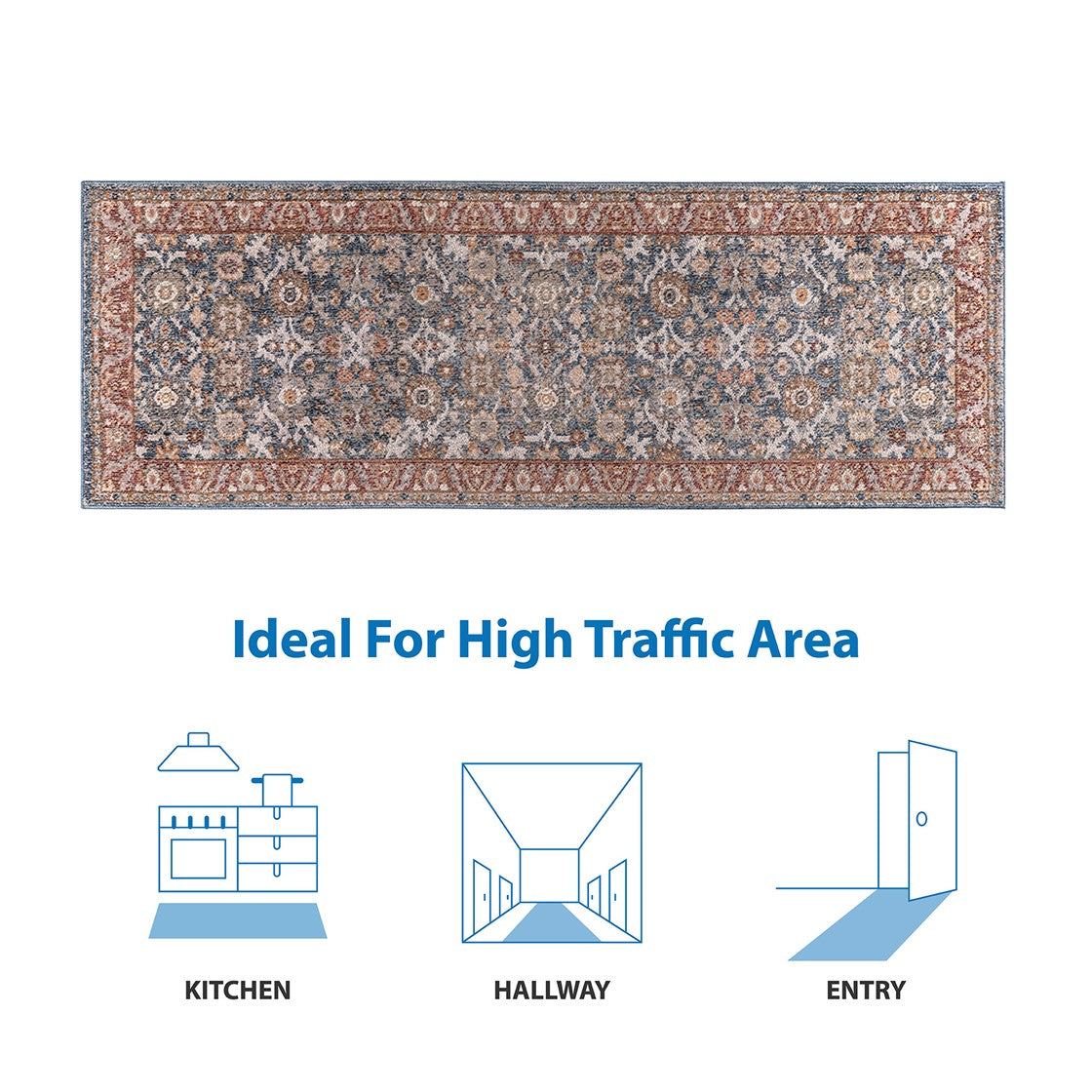 The Madison Park Faith Persian Bordered Traditional Blue and Red Woven Area Rug brings a touch of beauty to elevate your decor. This area rug features a traditional Persian design with a patterned border in rich shades of red and blue colors, for an elegant look. The soft, medium pile makes the woven rug well suited for high traffic areas, while the transparent sprayed latex reverse helps keep the rug from sliding. A rug pad is still highly recommended to keep the rug in place. Stain and fade resistant, this woven area rug is OEKO-TEX certified, meaning it does not contain any harmful substances or chemicals to ensure quality comfort and wellness. Rug is available in multiple sizes, which makes it perfect for your living room, family room, or entryways. To clean, use a vacuum or spot clean.