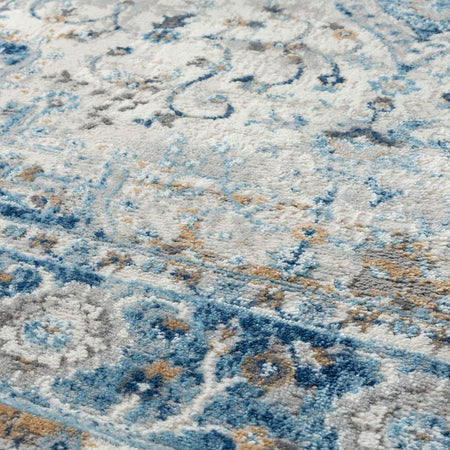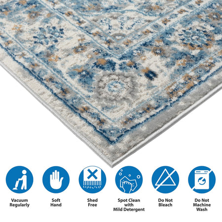 The Madison Park Frances Medallion Woven Area Rug offers a beautiful traditional update to your home decor. Made in Turkey, this machine woven area rug features a medallion pattern in shades of light blue to create a globally inspired look. The soft, medium pile makes the woven rug well suited for high traffic areas, while the transparent sprayed latex reverse helps keep the rug from sliding. A rug pad is still highly recommended to keep the rug in place. Stain and fade resistant, this woven area rug is OEKO-TEX certified, meaning it does not contain any harmful substances or chemicals to ensure quality comfort and wellness. Rug is available in multiple sizes, which makes it perfect for your living room, family room, or entryways. Clean with a vacuum or by spot cleaning.