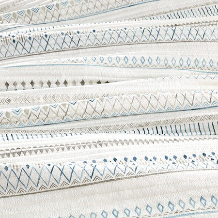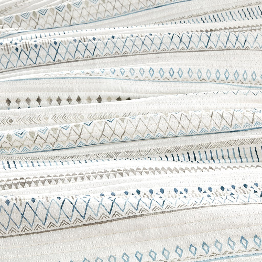 - Geometric dimaond print in soft blue and taupe colors on coverlet with taupe connected diamond print on the reverse side
