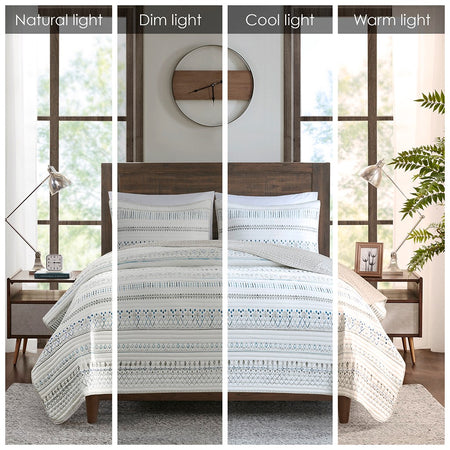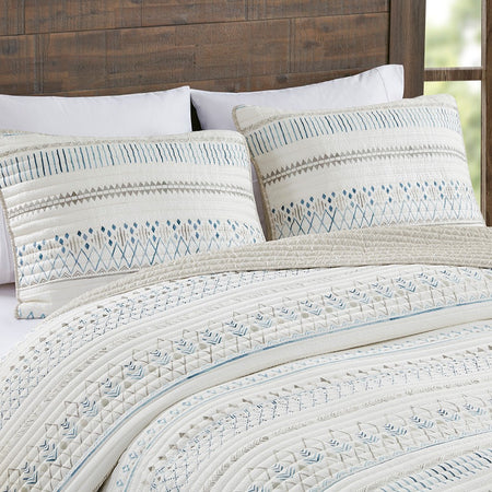Soft and lightweight, the Madison Park Fraser quilt set brings a Southwest inspired touch to your bed. A diamond print in soft blue and taupe colors adorns the face, while a taupe diamond print on the reverse adds a complementary farmhouse look. The channel quilting adds dimension and texture to the farmhouse quilt set, making it perfect to use by itself in the summer or as another layer of warmth in the winter. This reversible coverlet also features an antimicrobial treatment to help reduce the growth of odor causing bacteria and keep the fabric lasting longer.