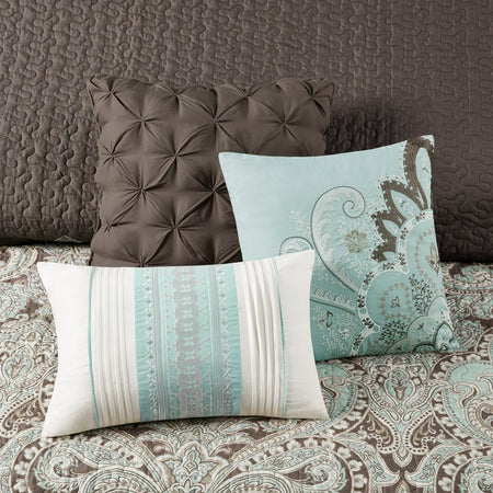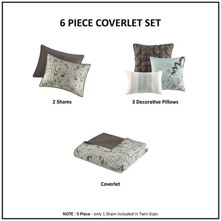 This 6 Piece Reversible Coverlet Set quilting helps make this motif stand out from the top of the bed while three decorative pillows use embroidery and fabric manipulation to add dimension to this collection and pull this whole look together.