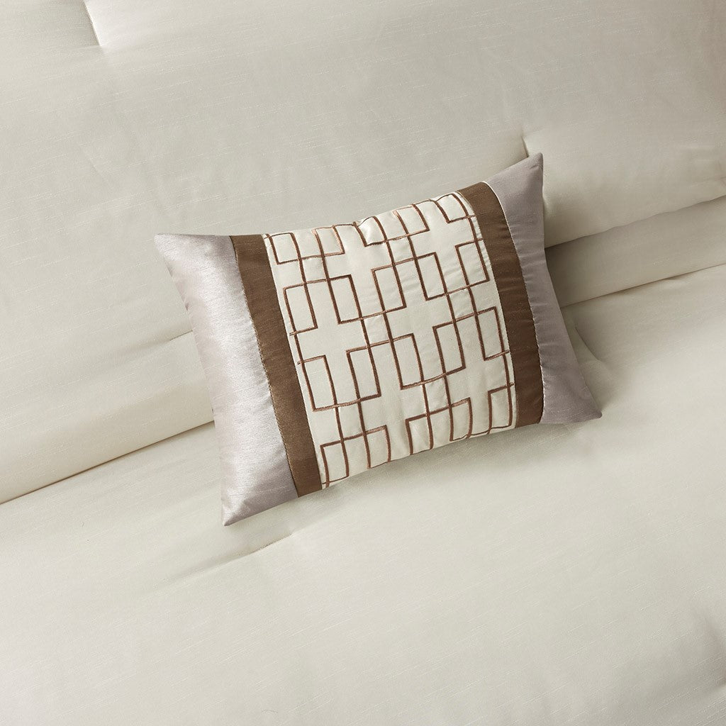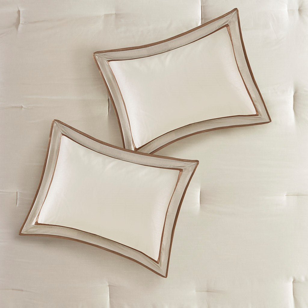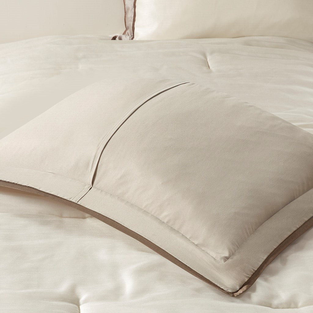 The Genevieve bedding collection creates a neutral feel to your space. This set is made from 100% polyester polyoni creating a sheen to the taupe, brown, and light taupe colorways in this bed. The taupe color creates a large border around the edge of the comforter and a brown border is used inside to really give the light taupe a pop in the center. The decorative pillows make use of these same borders and colors for a completely matching set while the brown bedskirt adds some drama with its dark coloring. With these neutral colorways and large borders, this set will be easy to accessorize in any room in your home. Items in the set may come in a rolled or compressed packaging, which will need to be fluffed up or steam ironed before use to remove wrinkles.