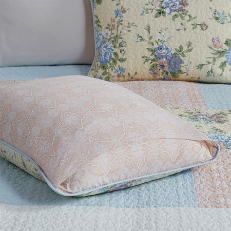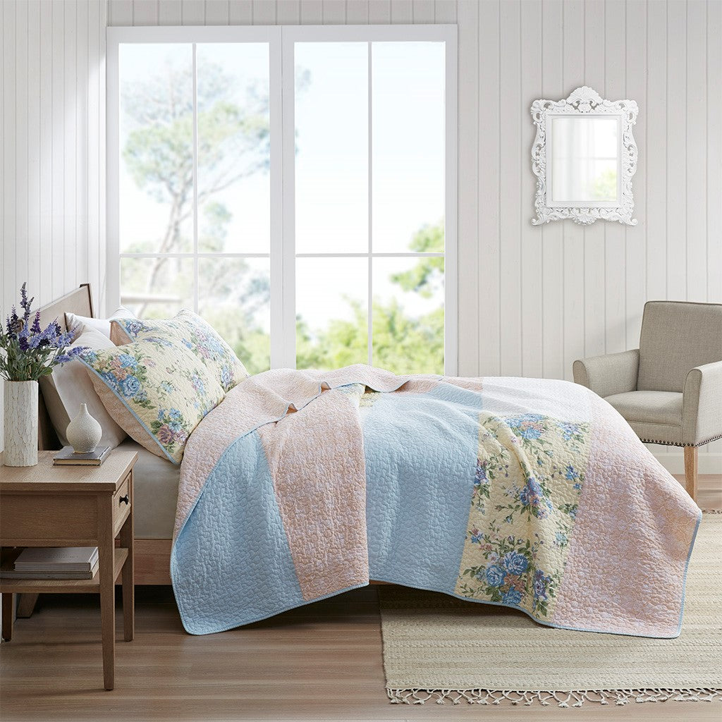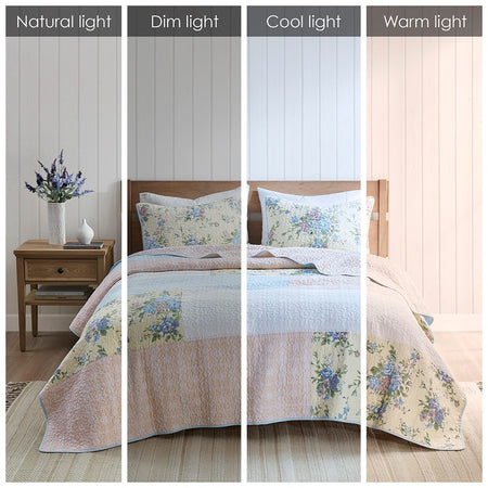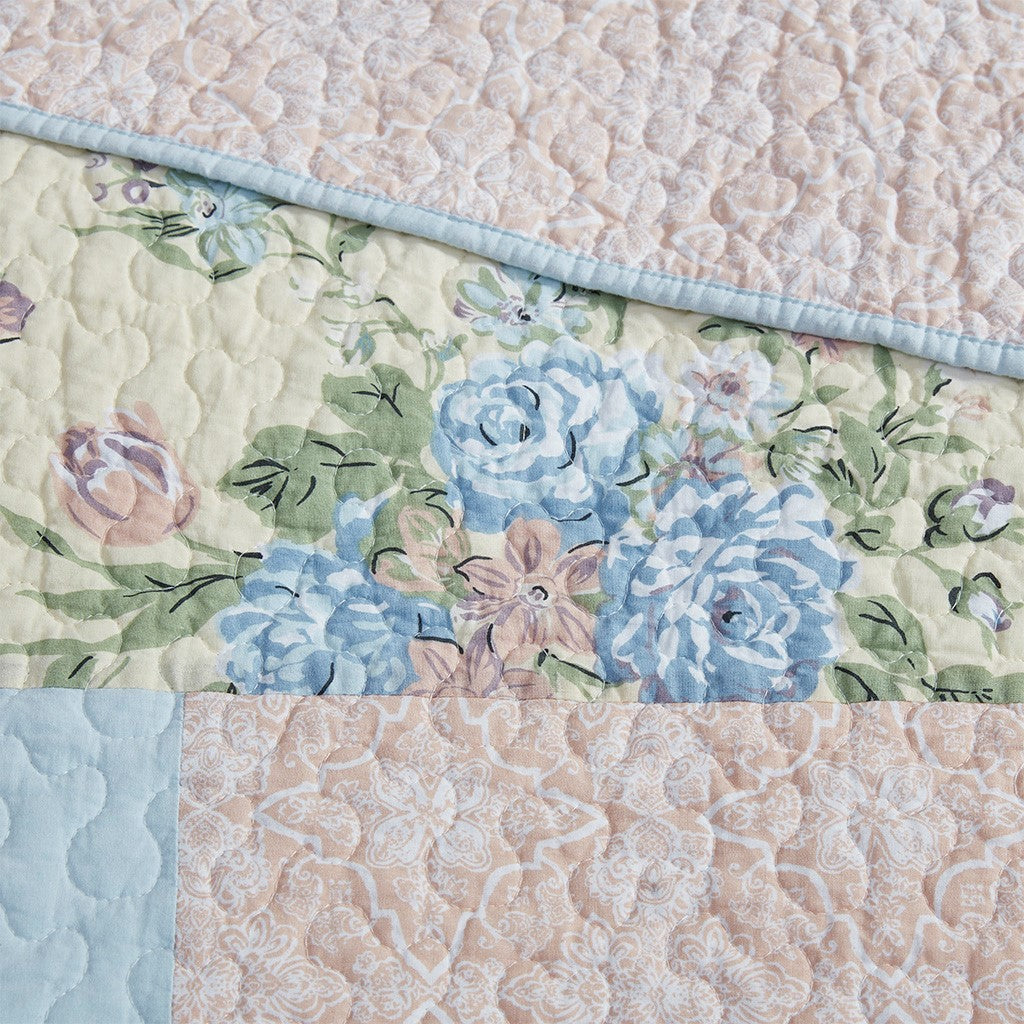 Bring your bedroom to life with the farmhouse style of the Madison Park Gretchen 3 Piece Reversible Cotton Coverlet Set. This reversible cotton coverlet features floral and medallion patterns pieced together with soft solid colors, creating a patchwork look. The 2 cotton shams coordinate with a section of the coverlet to complete the cotton bedding set. Machine washable for easy care, this farmhouse coverlet set has an antimicrobial treatment that provides built-in freshness protection, inhibits growth of odor causing bacteria, and keeps the fabric newer, longer.