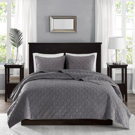 The Madison Park Harper Velvet 3 Piece Coverlet Set offers a casual and comfortable update to your bedroom. The polyester velvet coverlet features a soft texture with a geometric quilted design, for a rich look and feel. Matching shams pair beautifully with the coverlet to complete the quilt set. Providing a charming layering piece to your bed, this coverlet has an antimicrobial treatment that helps reduce bacteria buildup and odors, keeping the fabric fresh longer.