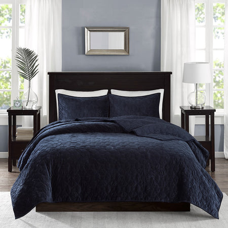 The Madison Park Harper Velvet 3 Piece Coverlet Set offers a casual and comfortable update to your bedroom. The polyester velvet coverlet features a soft texture with a geometric quilted design, for a rich look and feel. Matching shams pair beautifully with the coverlet to complete the quilt set. Providing a charming layering piece to your bed, this coverlet has an antimicrobial treatment that helps reduce bacteria buildup and odors, keeping the fabric fresh longer.