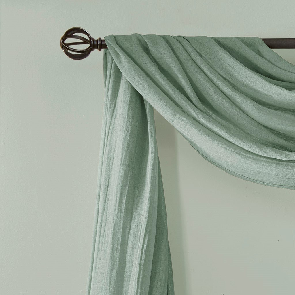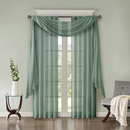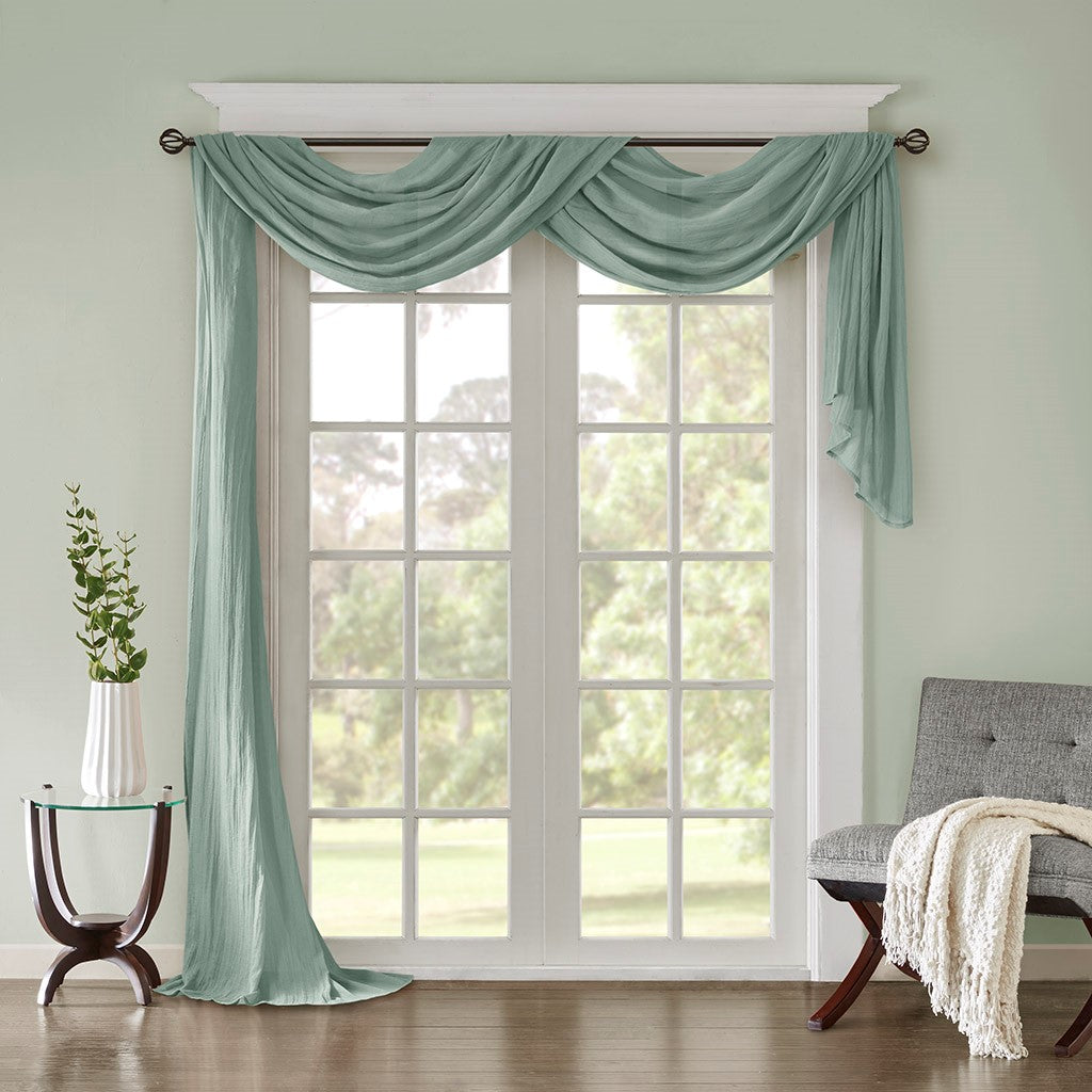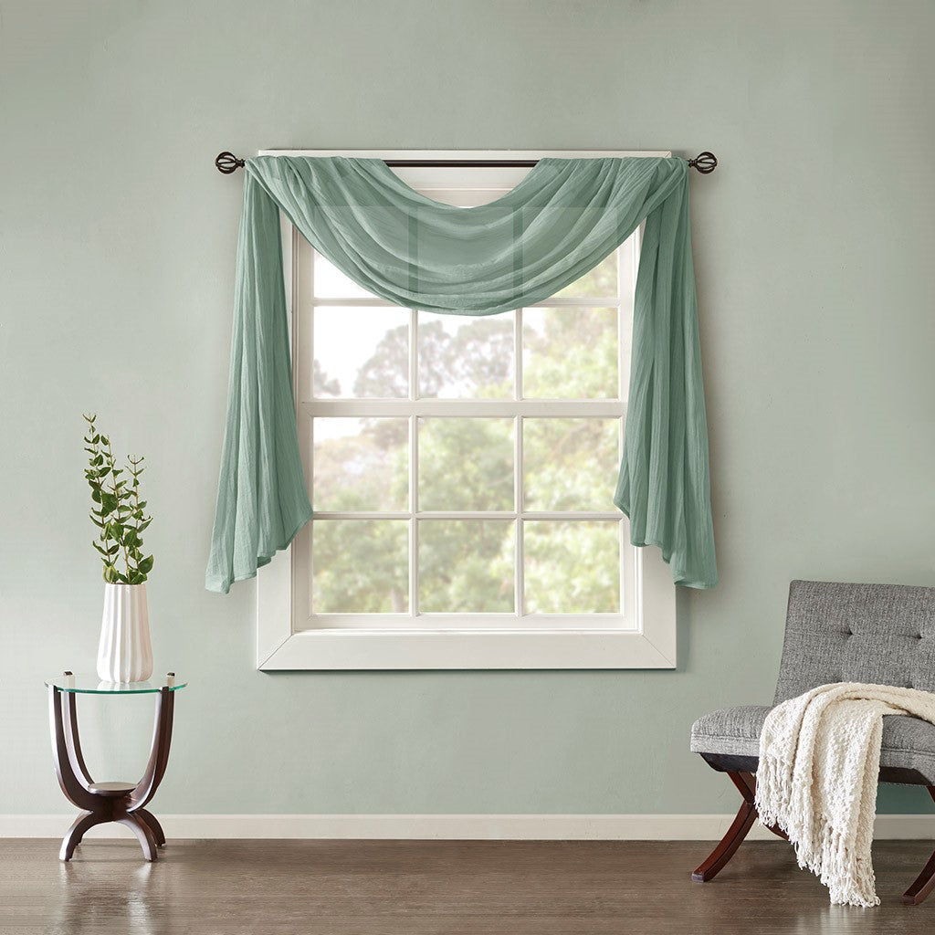 Soften the edges of your window, with our Madison Park Harper Solid Crushed Sheer Scarf. This dusty aqua scarf features crushed detailing for beautiful texture, while the lightweight sheer fabric provides easy draping and an airy touch to your decor. Four tabs are also included to make the DIY assembly easy so you can drape the scarf to best fit your window. For a complete look, layer this scarf with coordinating panels or prints in our collection for a more custom appeal.
