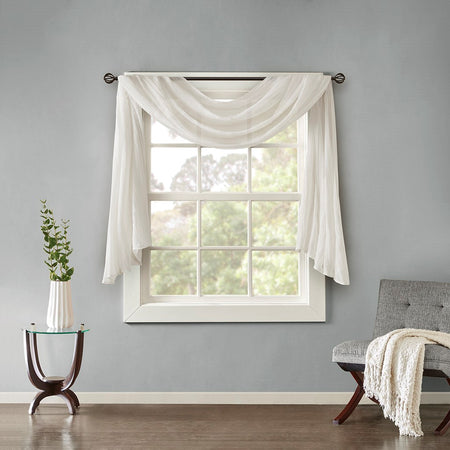 Soften the edges of your window, with our Madison Park Harper Solid Crushed Sheer Scarf. This crisp white scarf features crushed detailing for beautiful texture, while the lightweight sheer fabric provides easy draping and an airy touch to your decor. Four tabs are also included to make the DIY assembly easy so you can drape the scarf to best fit your window. For a complete look, layer this scarf with coordinating panels or prints in our collection for a more custom appeal.