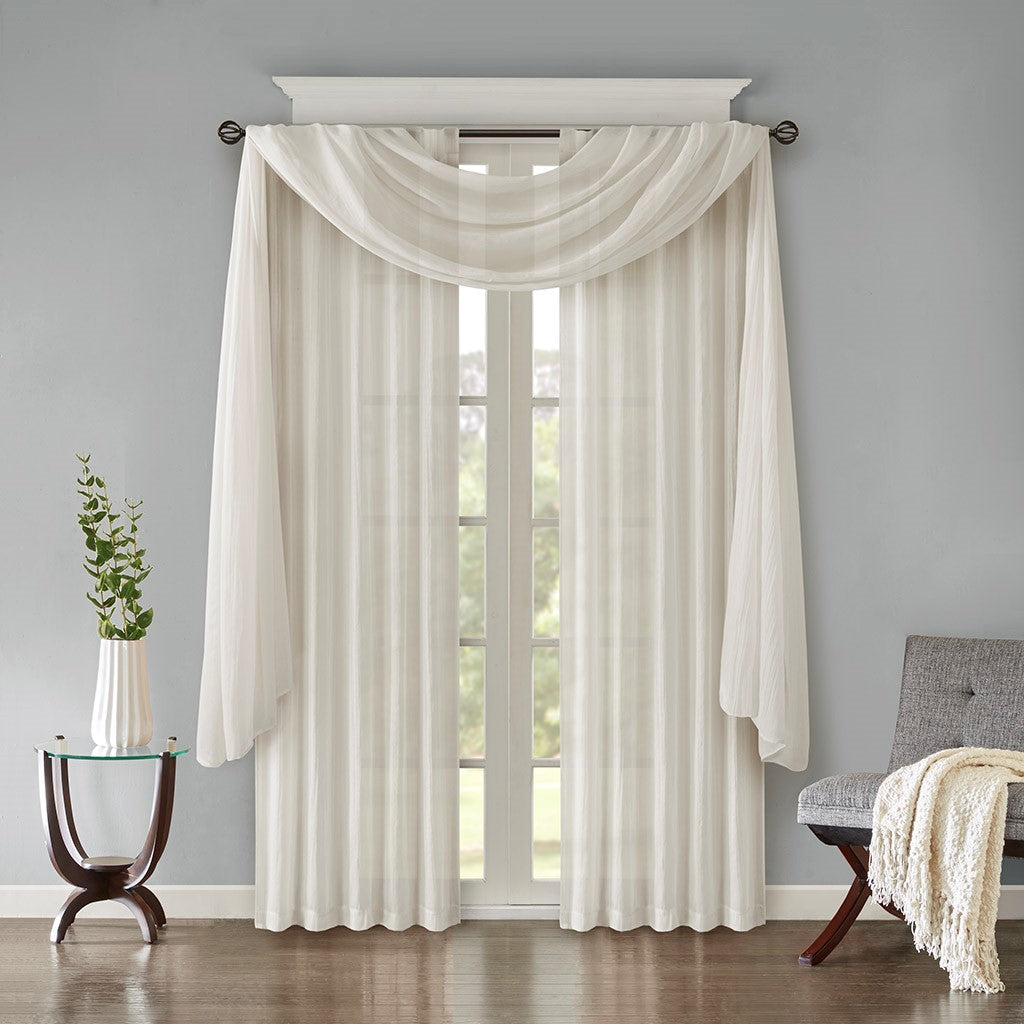 Soften the edges of your window, with our Madison Park Harper Solid Crushed Sheer Scarf. This crisp white scarf features crushed detailing for beautiful texture, while the lightweight sheer fabric provides easy draping and an airy touch to your decor. Four tabs are also included to make the DIY assembly easy so you can drape the scarf to best fit your window. For a complete look, layer this scarf with coordinating panels or prints in our collection for a more custom appeal.