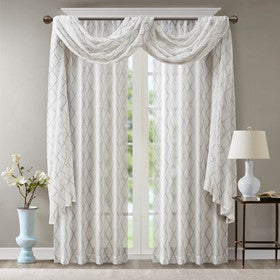 Madison Park's Irina Diamond Sheer Window Scarf provides an alluring update to your home. An elegant diamond pattern is beautifully embroidered on a soft sheer fabric, adding grace and charm to your decor. The neutral colors and light fabric helps create a delicate look to soften any room. Perfect on it's own as a beautiful drape to frame any window, or complete the look with coordinating window panels, sold separately.