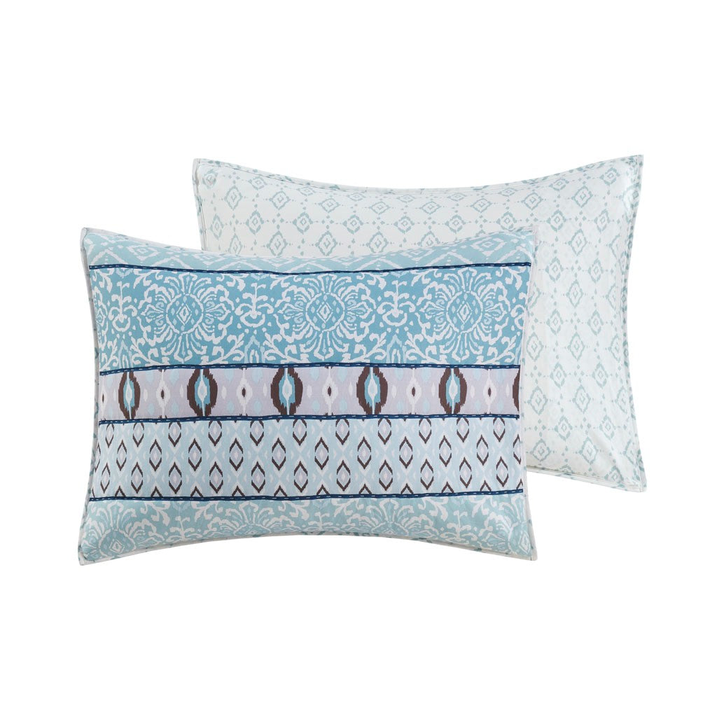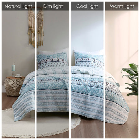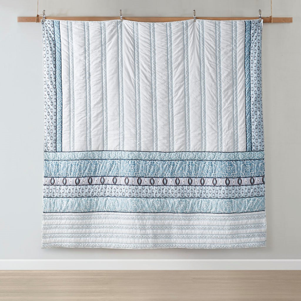 The Madison Park Kamila 3 Piece Reversible Coverlet Set brings a refreshing and bright update to your bedroom. This reversible coverlet features a panel print on the face that reverses to an all-over geometric print, for a charming farmhouse look. The 2 matching shams highlight the panel design to complement the quilted coverlet. Machine washable for easy care, this reversible coverlet set is perfect for use in the summer time or as an extra layer to keep you warm in the winter. This farmhouse coverlet also features an antimicrobial treatment provides built-in freshness protection, inhibits growth of odor causing bacteria, and keeps the fabric newer, longer.