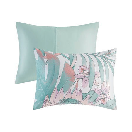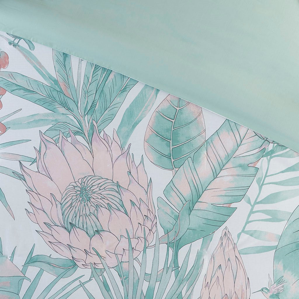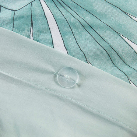 Create a serene atmosphere in your bedroom with the Madison Park Keilani 3 Piece Cotton Printed Duvet Cover Set. The white cotton duvet cover features a large botanical design in a soft and romantic color combination, for a shabby chic look. A solid aqua reverse complements the top of the duvet cover, while the 2 matching shams also showcase a floral print to complete the botanical duvet cover set. This cotton bedding set is also OEKO-TEX certified, meaning it does not contain any harmful substances or chemicals to ensure quality comfort and wellness. A button closure at the foot end secures a padded insert within the duvet cover and inside corner ties prevent it from shifting (insert is NOT included).