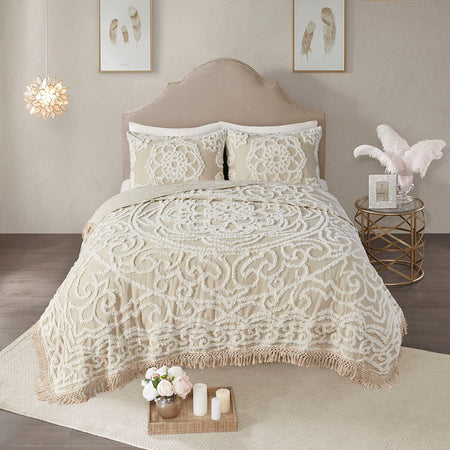 Laetitia Tufted Cotton Chenille Medallion Fringe Coverlet Mini Set - Taupe - Full Size / Queen Size