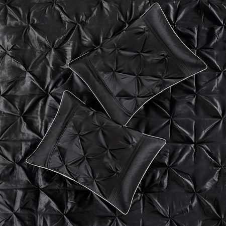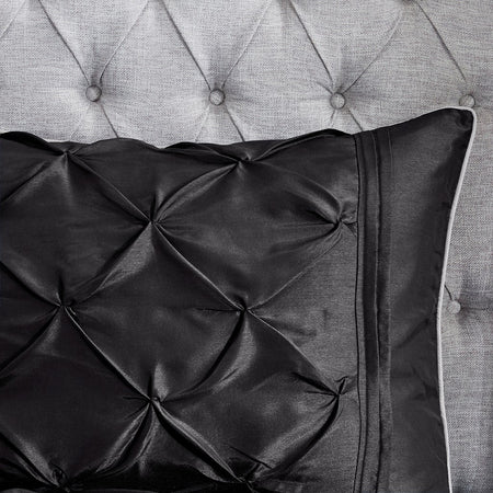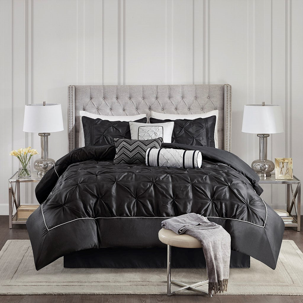 This beautifully tufted bed is from the Laurel Bedding Collection. Its gorgeous, true black color makes this set easy to accessorize your bedroom. The collection is made from 100% polyester polyoni and has pieced fabric sewn together to give this set dimension. It is finished with a smooth edge of fabric that creates a beautiful border around this comforter. Items in the set may come in a rolled or compressed packaging, which will need to be fluffed up or steam ironed before use to remove wrinkles.