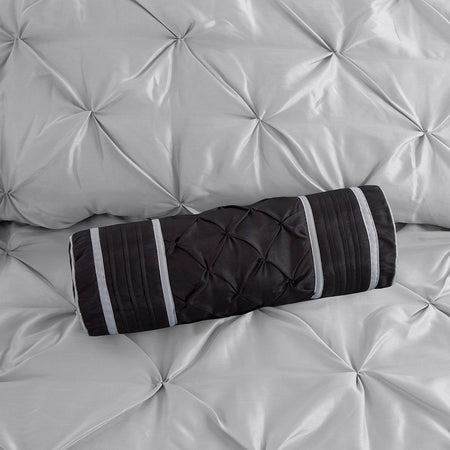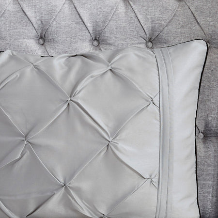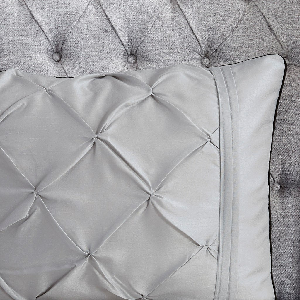 This beautifully tufted bed is from the Laurel bedding collection. Its grey coloring makes this set create a statement in your bedroom. The collection is made from 100% polyester polyoni and has pieced fabric sewn together providing added dimension. It is finished with a smooth edge of fabric that creates a beautiful border around this comforter. Items in the set may come in a rolled or compressed packaging, which will need to be fluffed up or steam ironed before use to remove wrinkles.
