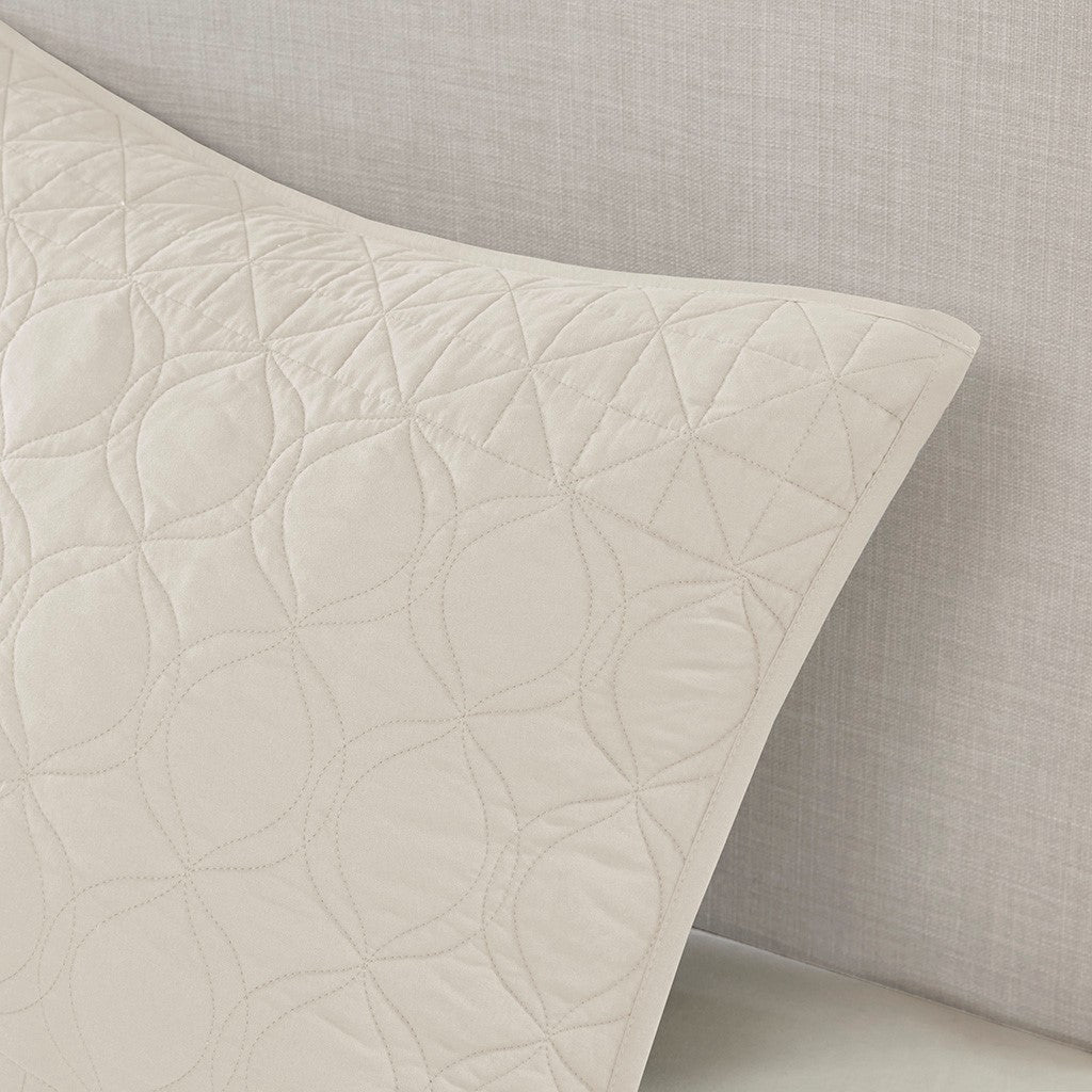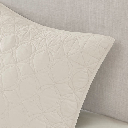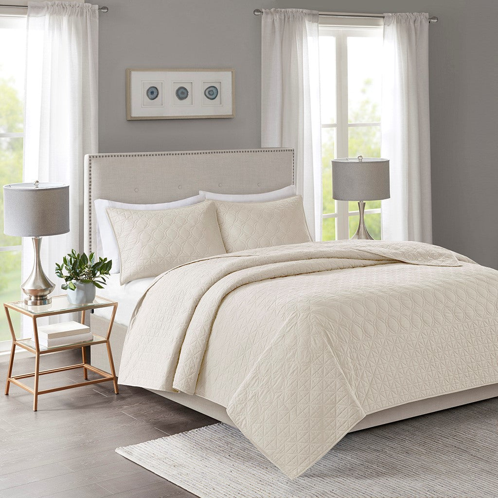 The Madison Park Linnette 3 Piece Reversible Coverlet Set offers a simple and elegant update to your bedroom. This cream quilted coverlet and matching shams feature two distinct quilting patterns that create an alluring textural look. A geometric design alternates with a circlet ogee pattern for added dimension and charm, while the prewashed fabric and cotton rich filling provide incredible softness and comfort. This coverlet also has an antimicrobial treatment that provides built-in freshness protection, reducing the growth of odor causing bacteria to keep fabric lasting longer.