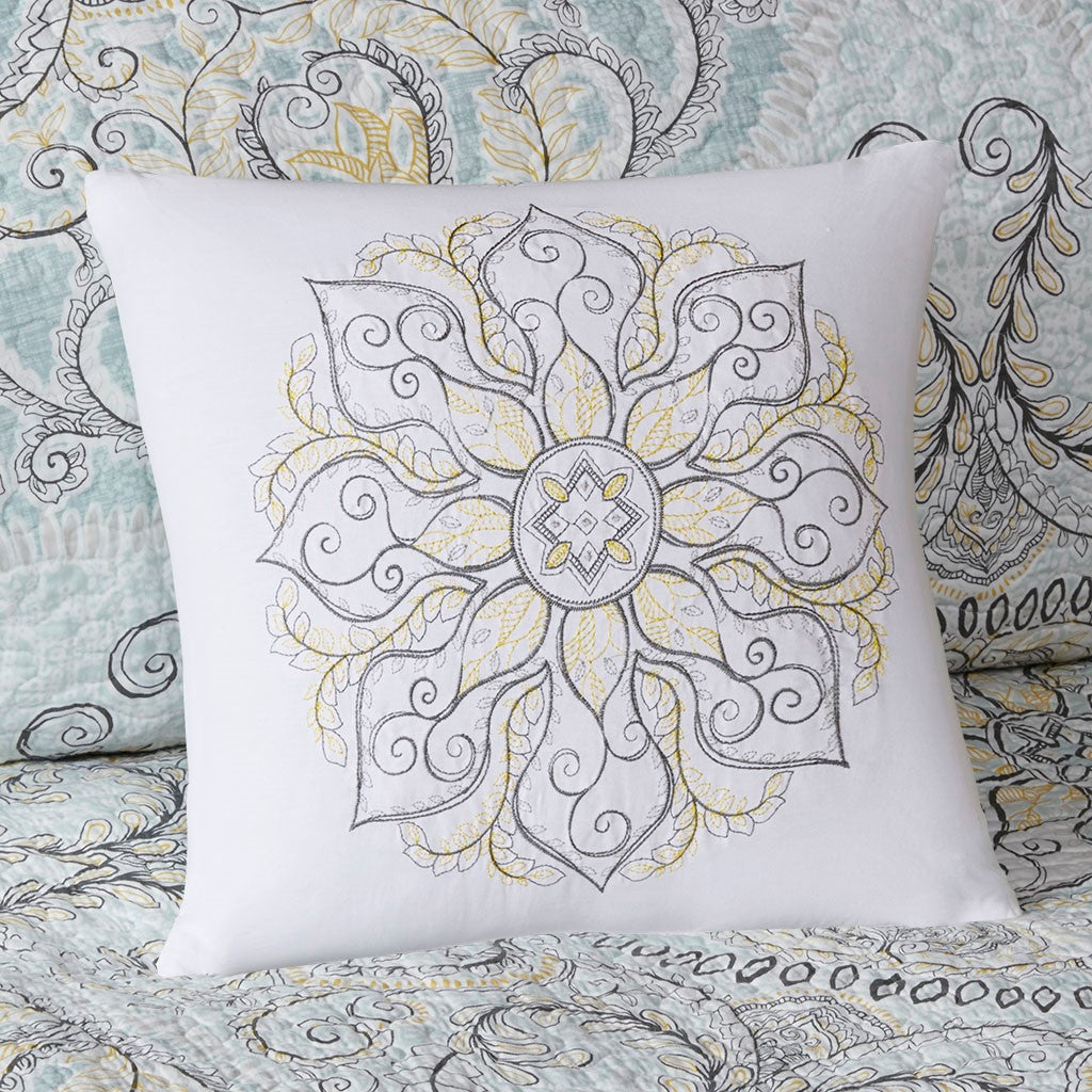 The Madison Park Lucinda 6 Piece Reversible Cotton Sateen Coverlet Set easily refreshes your bedroom decor. Completely reversible, this quilted coverlet features an over-scale printed medallion with delicate motifs in seafoam, white, and grey hues and a blue patterned reverse that creates a graceful look. Cotton rich filling within the coverlet boasts exceptional softness and warmth to keep you comfortable. The matching shams mirror the reverse of the coverlet for a beautiful coordinated ensemble, while three embroidered decorative pillows, in corresponding colors, add dimension and charm. With its globally inspired style, this cotton sateen coverlet set displays an elegant sheen and is machine washable for easy care.
