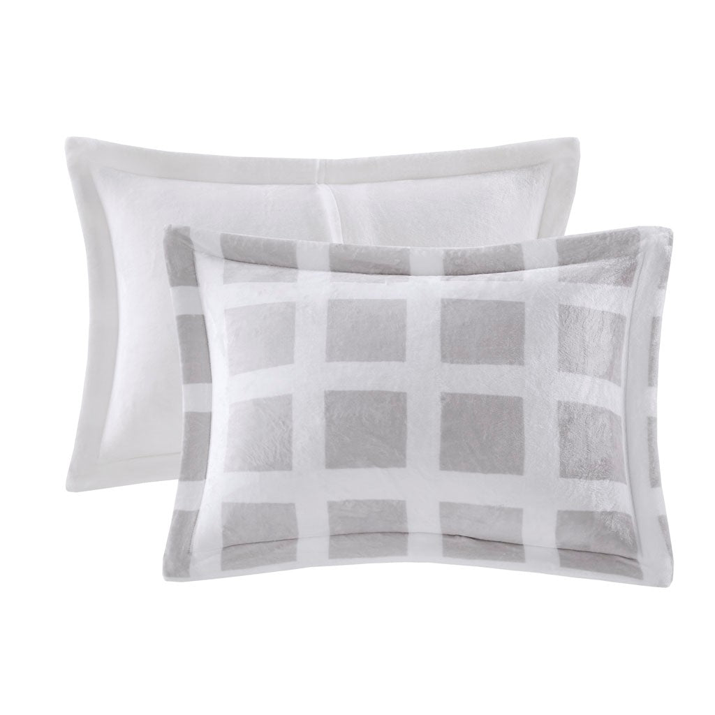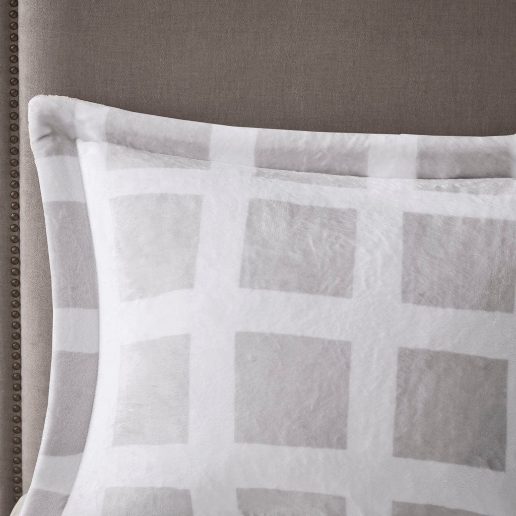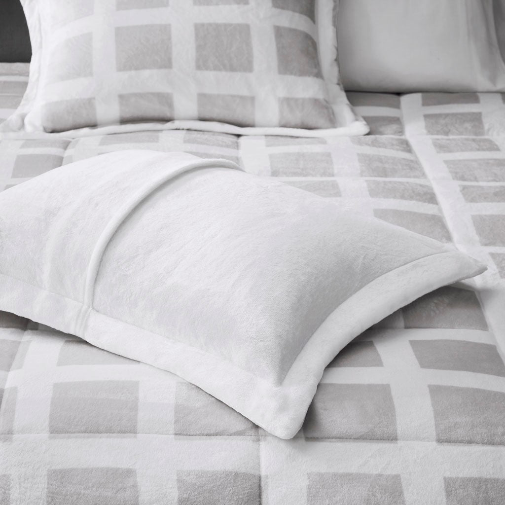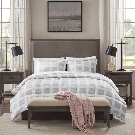 Sleep soundly in the pure plush comfort of the Madison Park Mae Plush Comforter Set. The comforter features a grey geometric print on the plush face with a solid white reverse to create luxurious look and feel. Matching shams (1 for Twin Sizes) coordinate perfectly with the plush reversible comforter, while box sewn quilting on the comforter keeps the filling in place. Ultra-soft for a cozy night's sleep, this reversible comfort set is sure to keep warm through the night and is machine washable for easy care. This comforter set is also OEKO-TEX certified, meaning it does not contain any harmful substances or chemicals to ensure quality comfort and wellness. Items in the set may come in a rolled or compressed packaging, which will need to be fluffed up or steam ironed before use to remove wrinkles.
