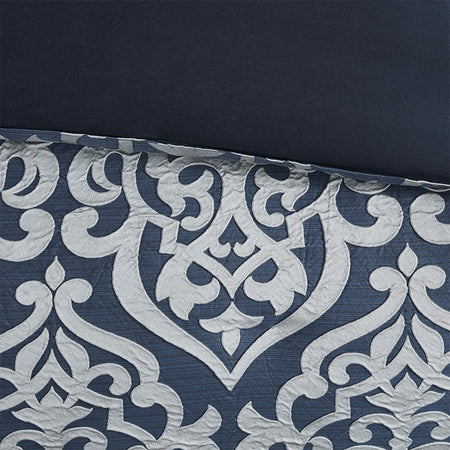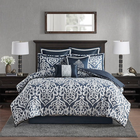 Add a touch of class to your bedroom with the Madison Park Odette 8 Piece Jacquard Comforter Set. The luxurious textured jacquard comforter and shams flaunt a gorgeous damask medallion design with silver striations on the satin ground that add dimension to the lavish look. A solid navy reverse and stunning Euro shams complement the top of the bed to complete the ensemble. Also included are two decorative pillows that feature embroidery and cording details, while a solid navy bed skirt provides a clean and elegant finish. Overfilled for superior warmth and comfort, this jacquard comforter set offers a strikingly luxurious update to your decor. Items in the set may come in a rolled or compressed packaging, which will need to be fluffed up or steam ironed before use to remove wrinkles.