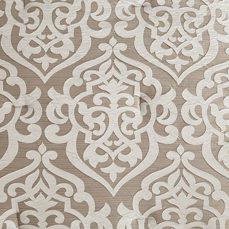 Add a touch of class to your bedroom with the Madison Park Odette 8 Piece Jacquard Comforter Set. The luxurious textured jacquard comforter and shams flaunt a gorgeous damask medallion design with ivory striations on the satin ground that add dimension to the lavish look. A solid neutral reverse and stunning Euro shams complement the top of the bed to complete the ensemble. Also included are two decorative pillows that feature embroidery and cording details, while a solid neutral bed skirt provides a clean and elegant finish. Machine washable for easy care, This jacquard comforter set offers a strikingly luxurious update to your decor. Items in the set may come in a rolled or compressed packaging, which will need to be fluffed up or steam ironed before use to remove wrinkles.