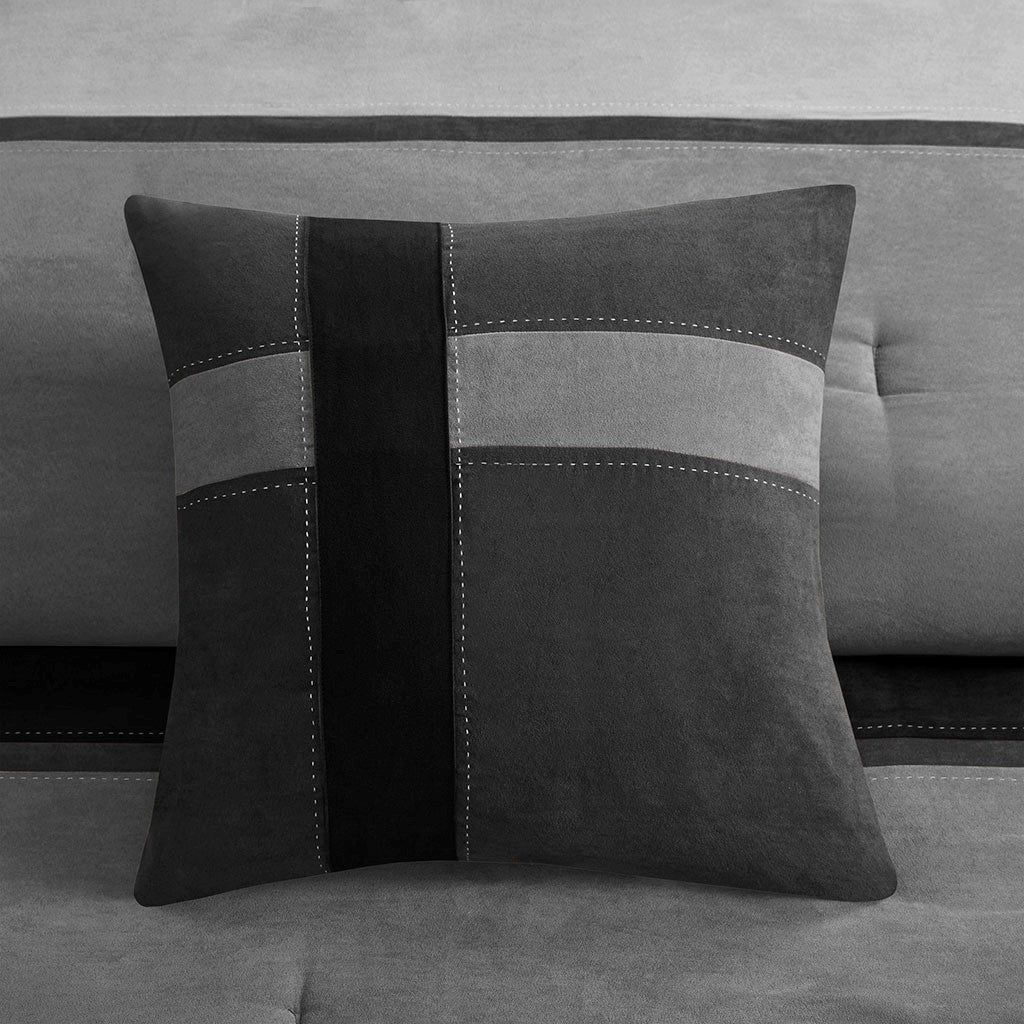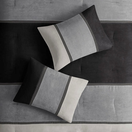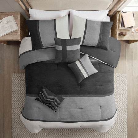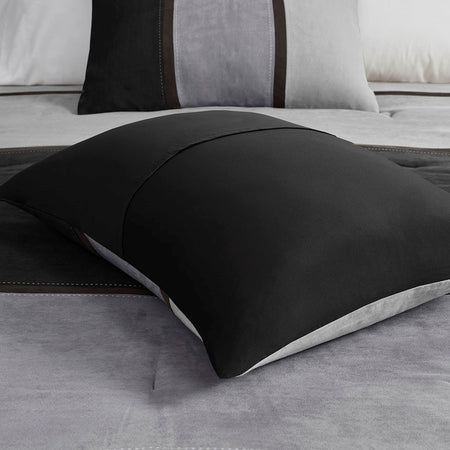 The Madison Park Palisades 7 Piece Faux Suede Comforter Set offers you a casual alternative in fashion bedding. The reverse of the comforter is solid black. The soft microsuede in light grey, charcoal, and black is pieced together to create this beautiful bed. The decorative pillows are embroidered and pieced to add a decorative element to this simple, yet beautiful bedding collection. With hypoallergenic filling in the comforter and pillows, this stylish comforter set easily refreshes your bedroom decor and is machine washable for easy care. Items in the set may come in a rolled or compressed packaging, which will need to be fluffed up or steam ironed before use to remove wrinkles.