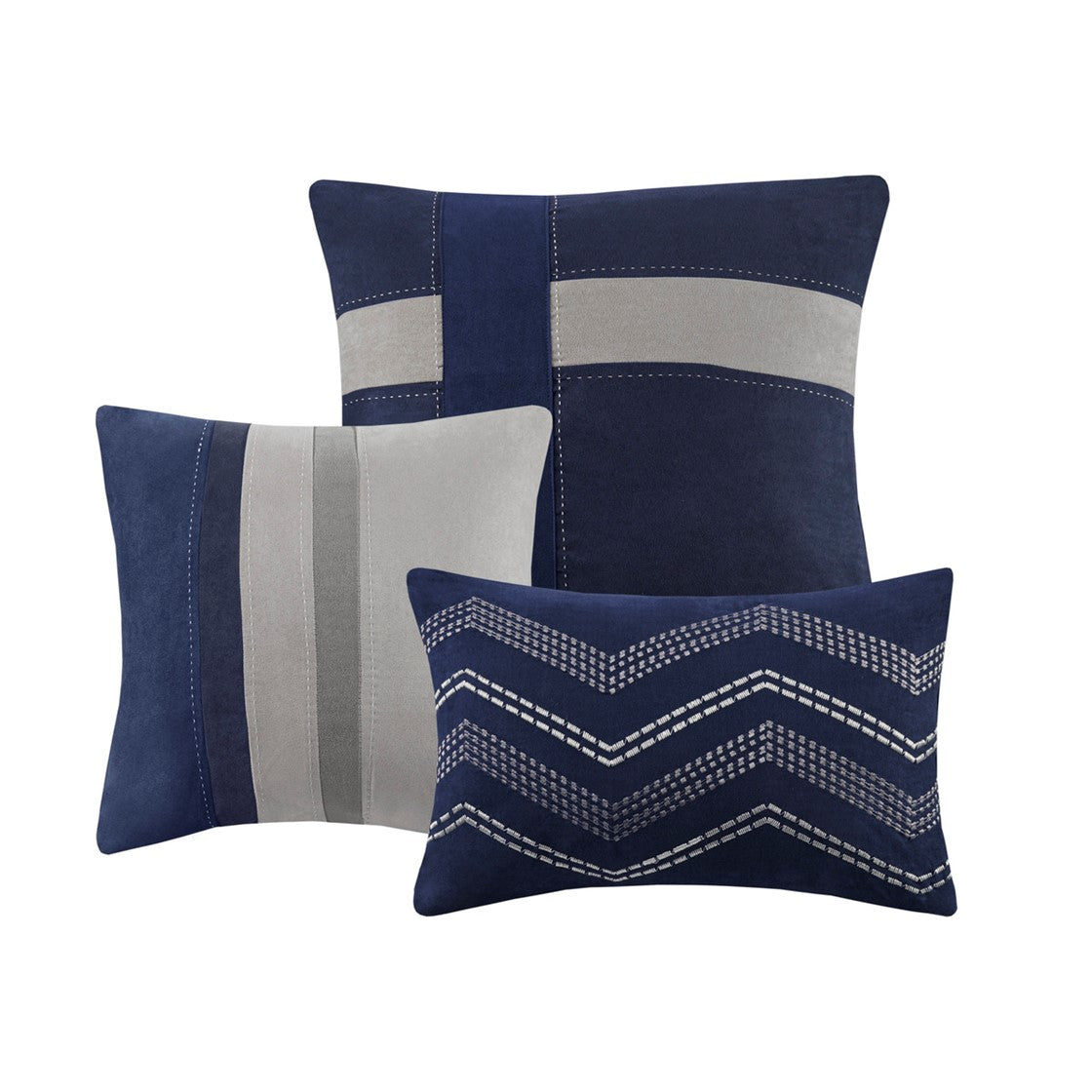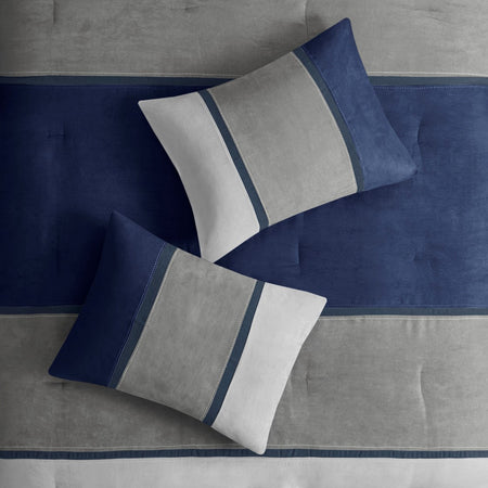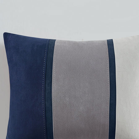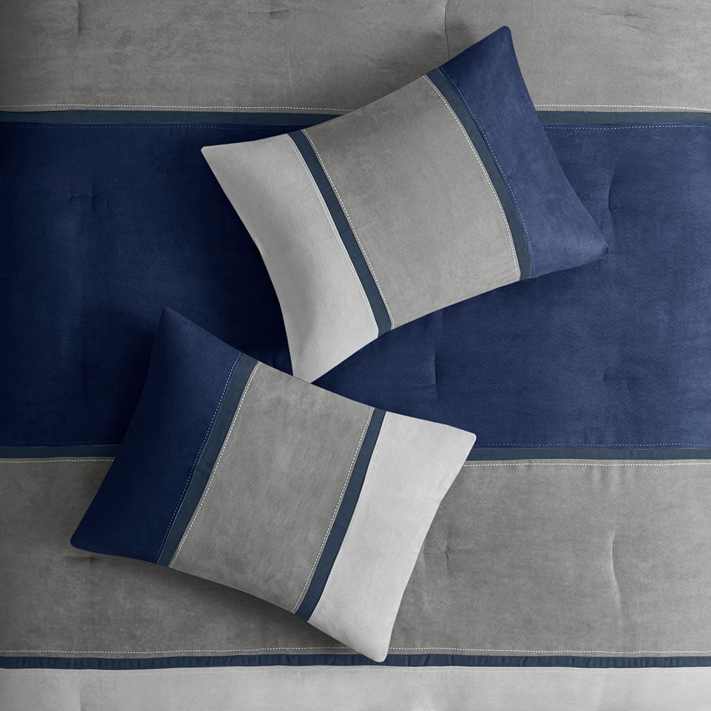 The Madison Park 7 Piece Palisades Comforter Set offers you a casual alternative in fashion bedding. The reverse of the comforter is solid blue. The soft microsuede in heather grey, blue and charcoal grey is pieced together to create this beautiful bed. The decorative pillows are embroidered and pieced to add a decorative element to this simple, yet beautiful bedding collection. With hypoallergenic filling in the comforter and pillows, this stylish comforter set easily refreshes your bedroom decor and is machine washable for easy care. Items in the set may come in a rolled or compressed packaging, which will need to be fluffed up or steam ironed before use to remove wrinkles.