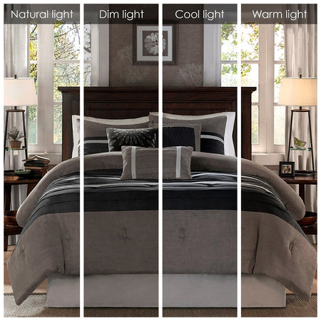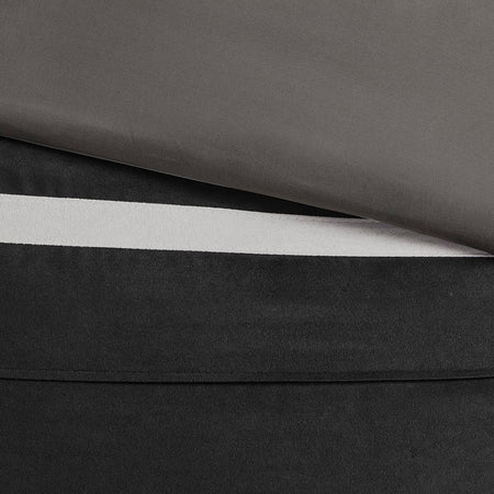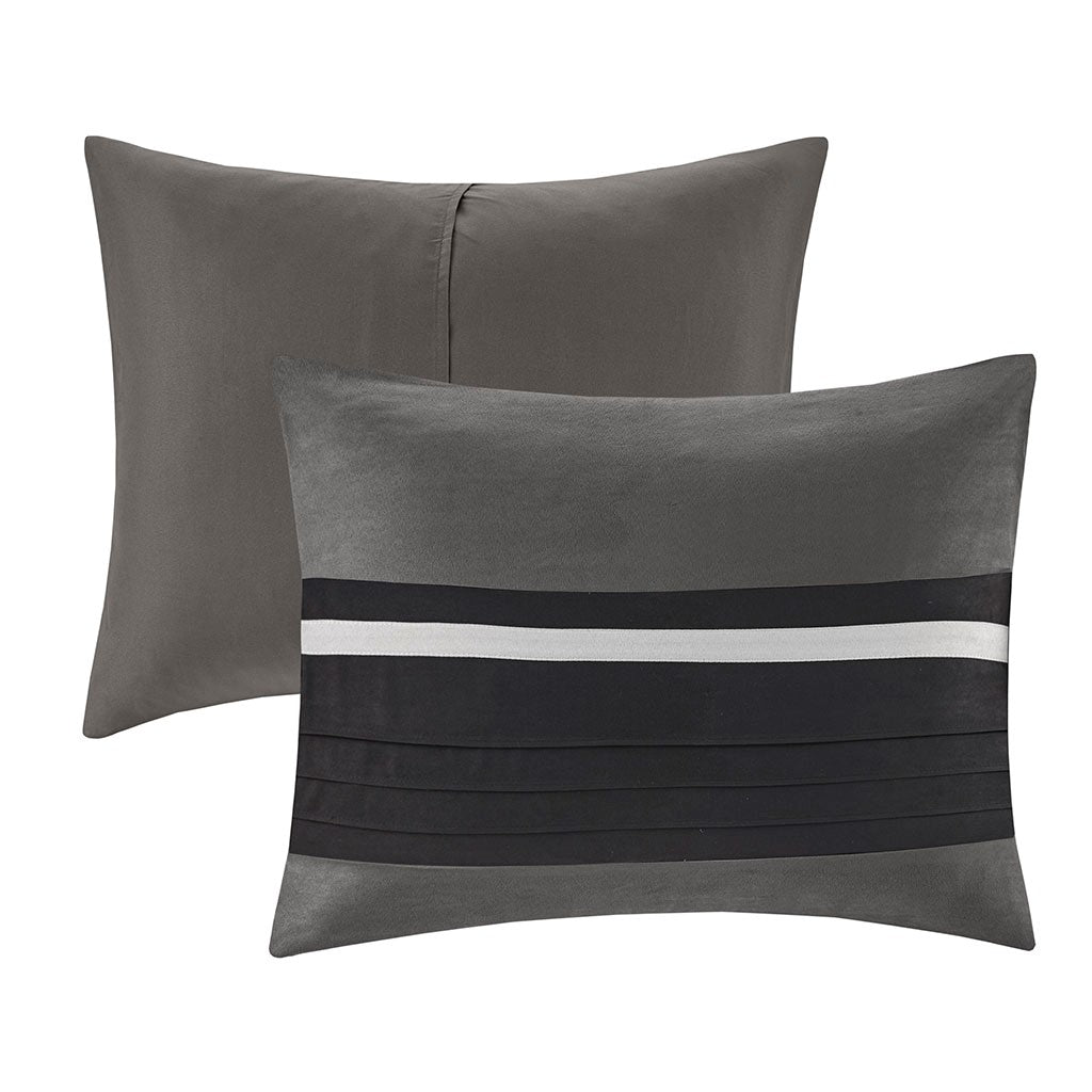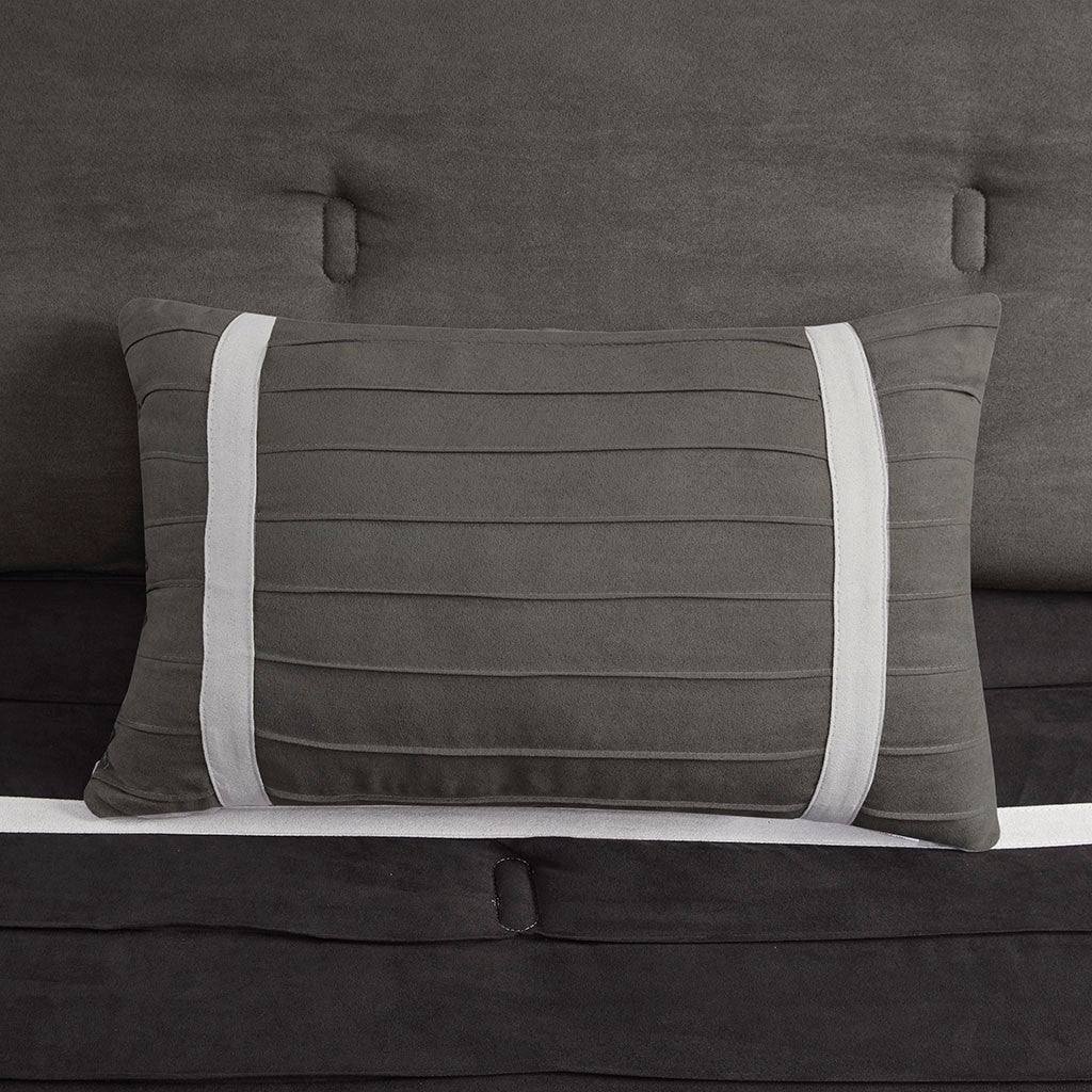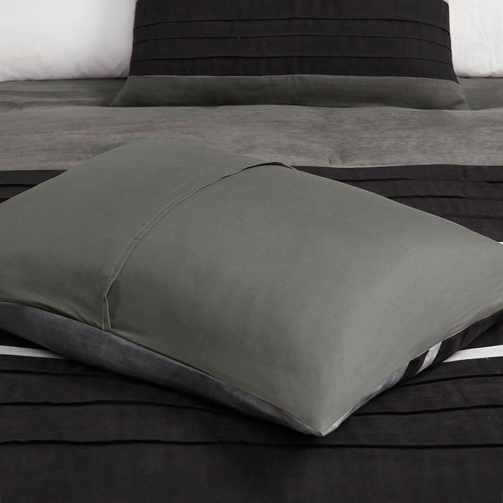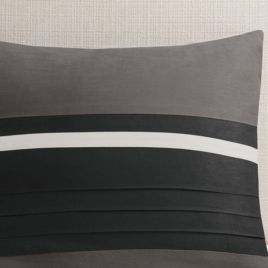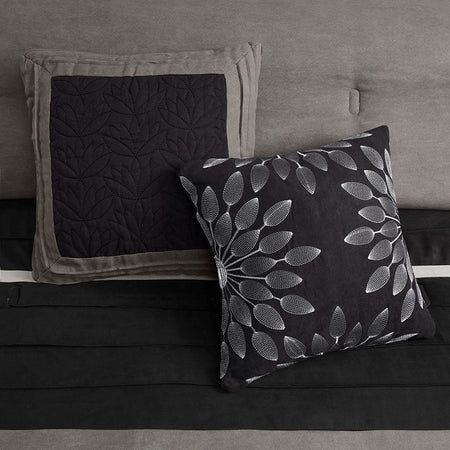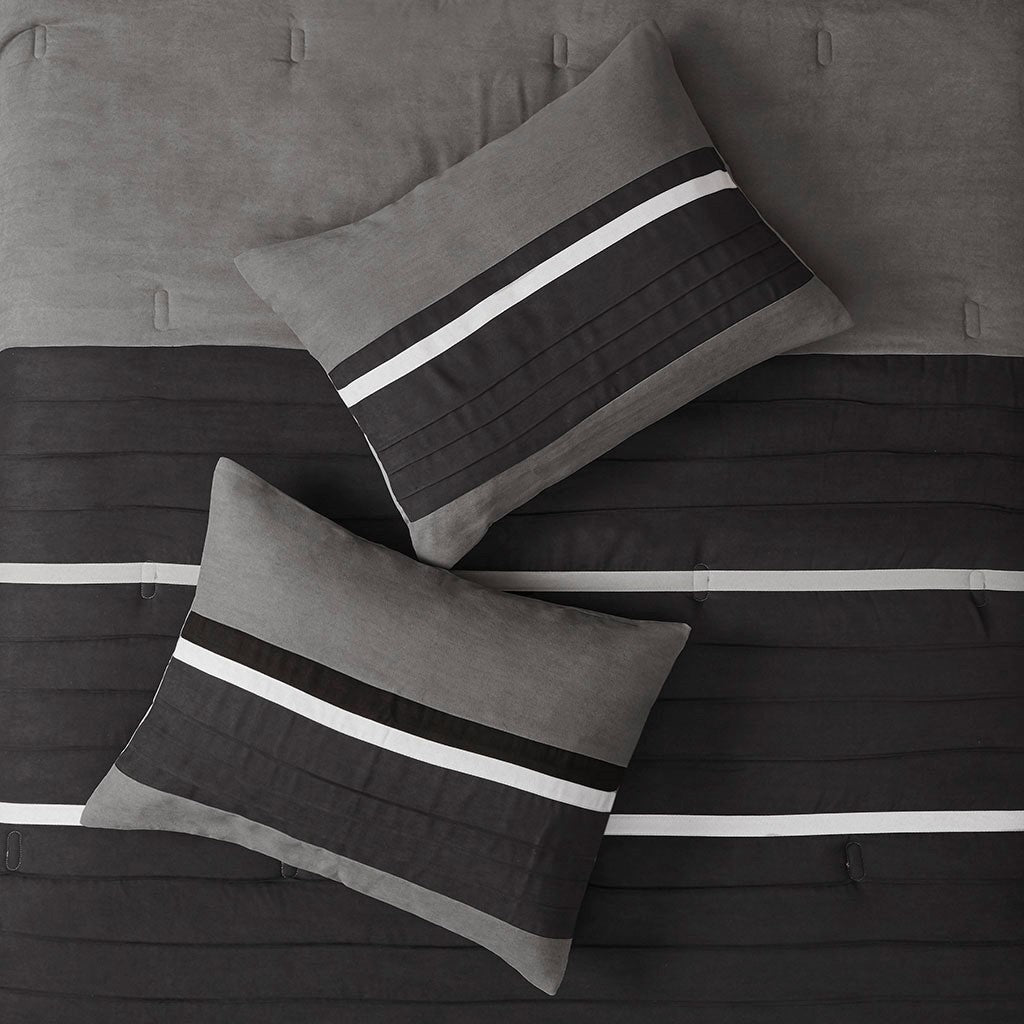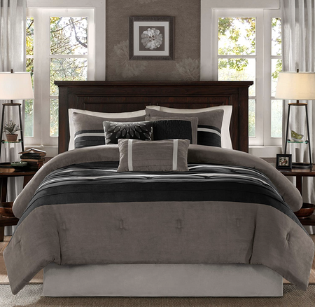 The Madison Park Palmer 7 Piece Comforter Set offers a classic and refined update to your bedroom decor. This transitional style comforter features a pieced microsuede design in rich contrasting black and grey colors to create an incredibly soft look and feel. The 2 matching shams also flaunt a pieced construction to coordinate with the faux suede comforter. A solid grey bed skirt and 3 decorative pillows with a mix of embroidered designs add the perfect finishing touches to complete this lush traditionally-inspired comforter. Machine washable for easy care, items in the set may come in a rolled or compressed packaging, which will need to be fluffed up or steam ironed before use to remove wrinkles.