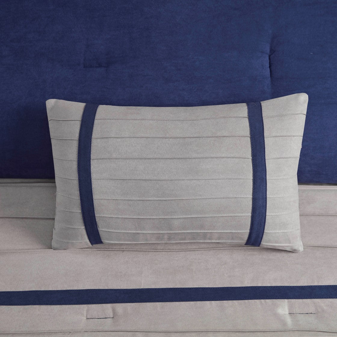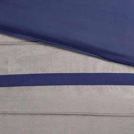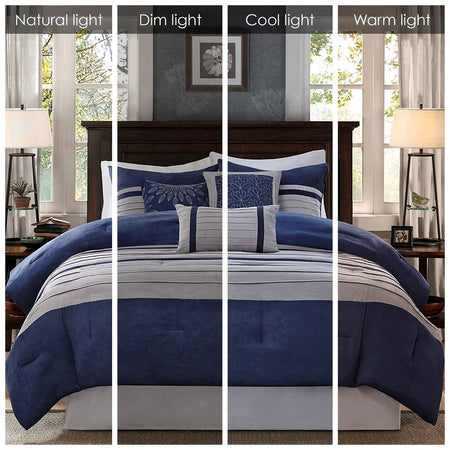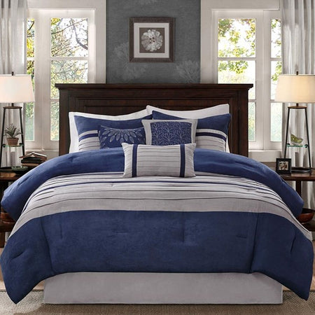 The Madison Park Palmer 7 Piece Comforter Set offers a classic and refined update to your bedroom decor. This transitional style comforter features a pieced microsuede design in rich contrasting blue and grey colors to create an incredibly soft look and feel. The 2 matching shams also flaunt a pieced construction to coordinate with the faux suede comforter. A solid grey bed skirt and 3 decorative pillows with a mix of embroidered designs add the perfect finishing touches to complete this lush traditionally-inspired comforter. Machine washable for easy care, items in the set may come in a rolled or compressed packaging, which will need to be fluffed up or steam ironed before use to remove wrinkles.