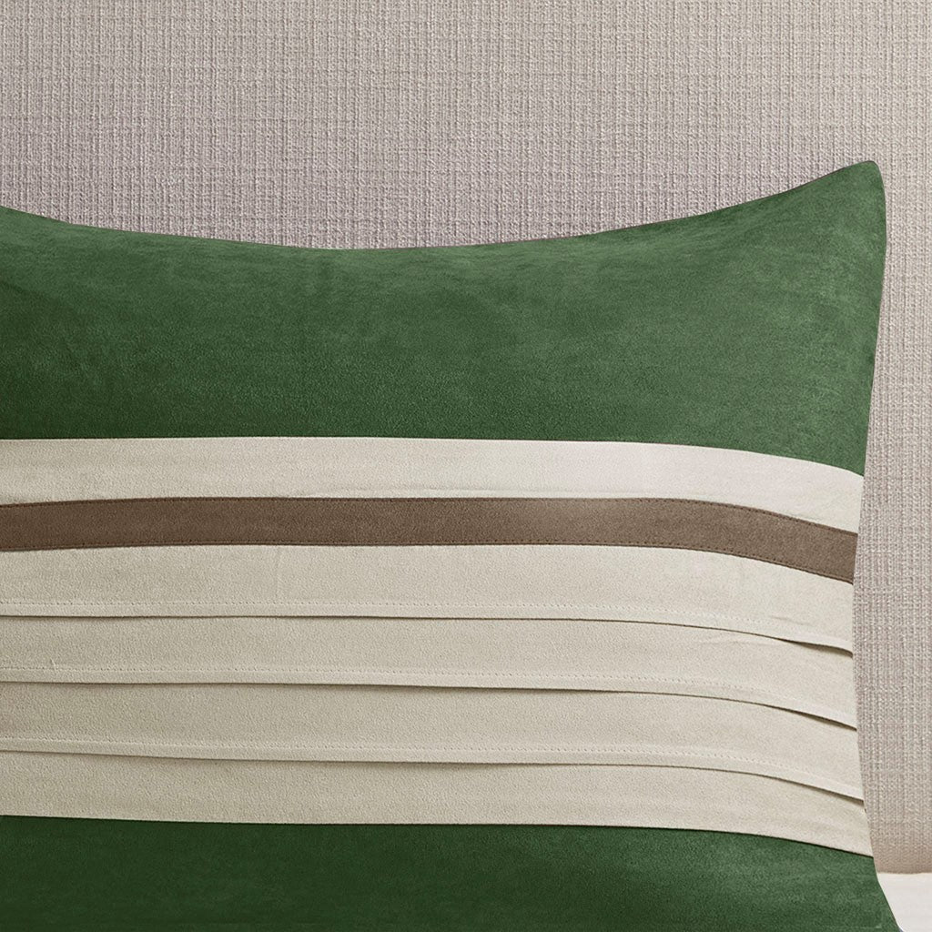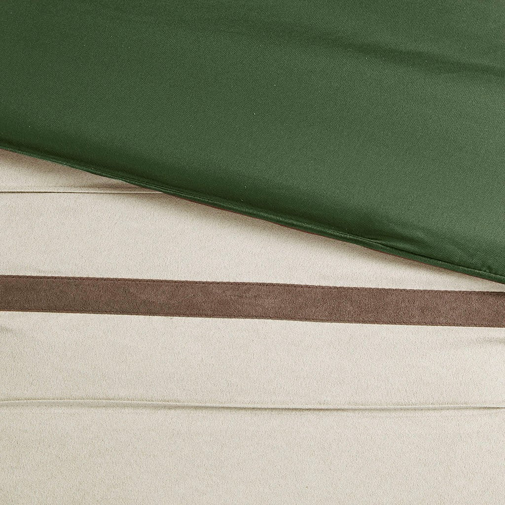 The Madison Park Palmer 7 Piece Comforter Set offers a classic and refined update to your bedroom decor. This transitional style comforter features a pieced microsuede design in rich contrasting green and beige colors to create an incredibly soft look and feel. The 2 matching shams also flaunt a pieced construction to coordinate with the faux suede comforter. A solid beige bed skirt and 3 decorative pillows with a mix of embroidered designs add the perfect finishing touches to complete this lush traditionally-inspired comforter. Machine washable for easy care, items in the set may come in a rolled or compressed packaging, which will need to be fluffed up or steam ironed before use to remove wrinkles.