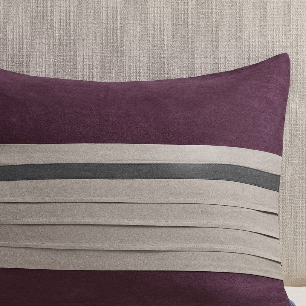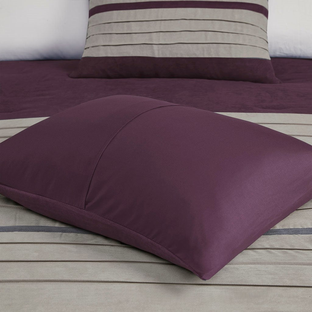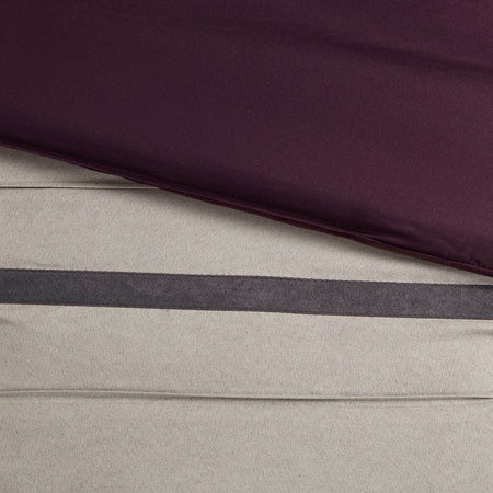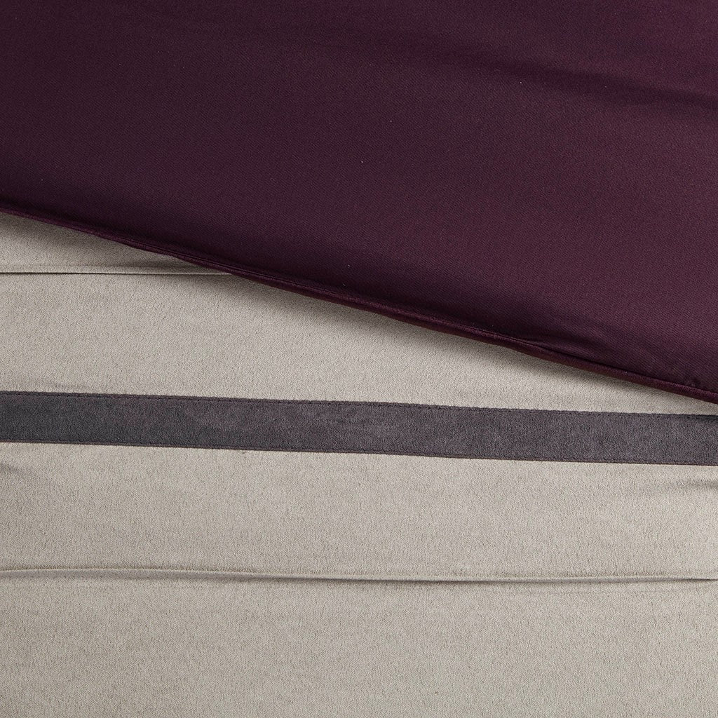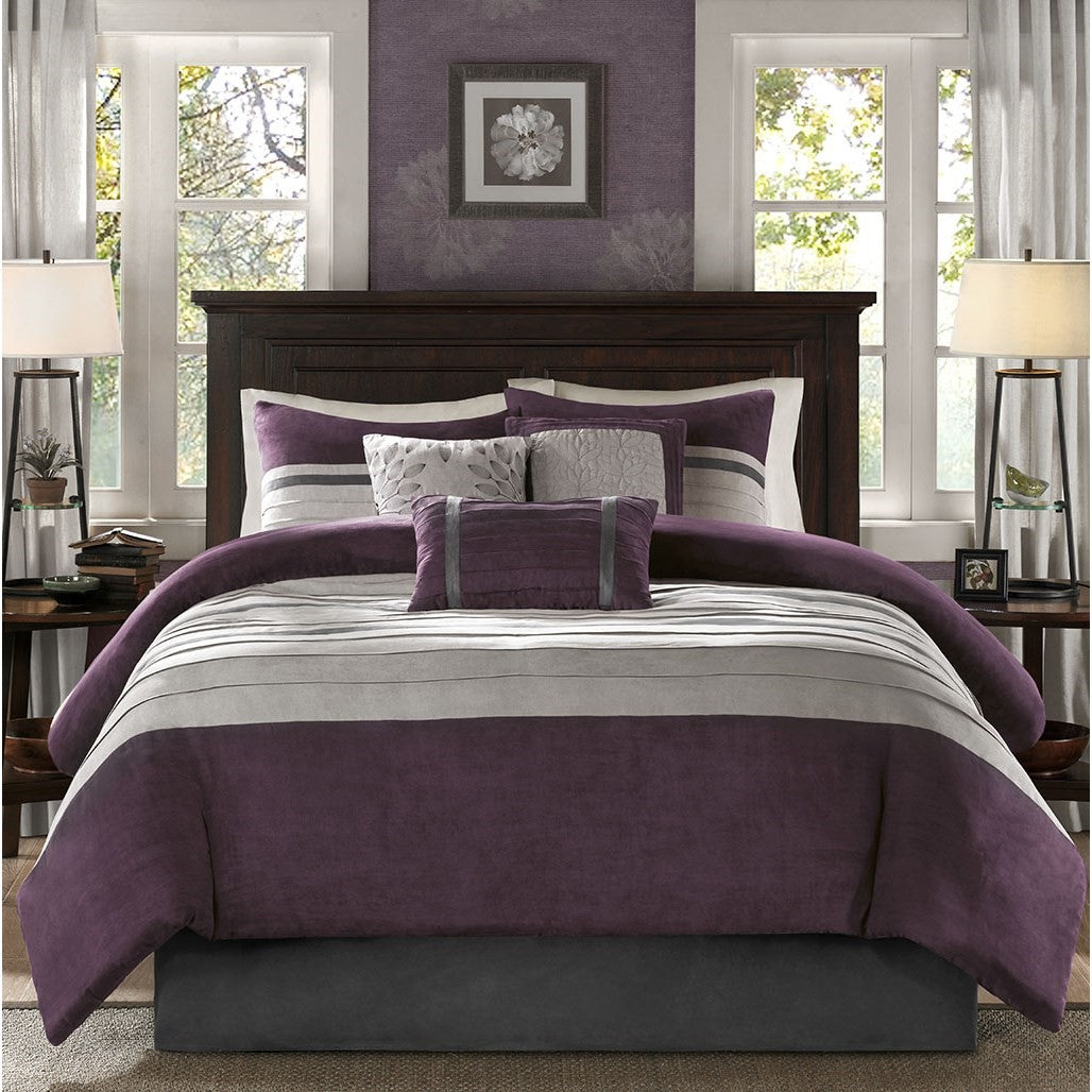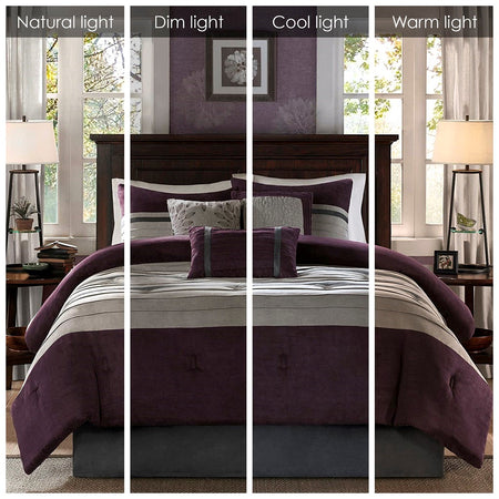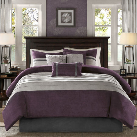 The Madison Park Palmer 7 Piece Comforter Set offers a classic and refined update to your bedroom decor. This transitional style comforter features a pieced microsuede design in rich contrasting plum and grey colors to create an incredibly soft look and feel. The 2 matching shams also flaunt a pieced construction to coordinate with the faux suede comforter. A solid grey bed skirt and 3 decorative pillows with a mix of embroidered designs add the perfect finishing touches to complete this lush traditionally-inspired comforter. Machine washable for easy care, items in the set may come in a rolled or compressed packaging, which will need to be fluffed up or steam ironed before use to remove wrinkles.