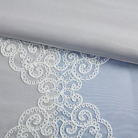 Elegance and glam are brought together in the beautiful transitional design of this luxury comforter set. Soft gray and blue colors are accented by coordinating white floral embroidery to create an understated and charming look. The solid gray reverse complements the top of the bed and gracefully tailored shams match the delicate style of the comforter. Elevate your bedroom with the refreshing style and lush comfort of this embroidered comforter set.
