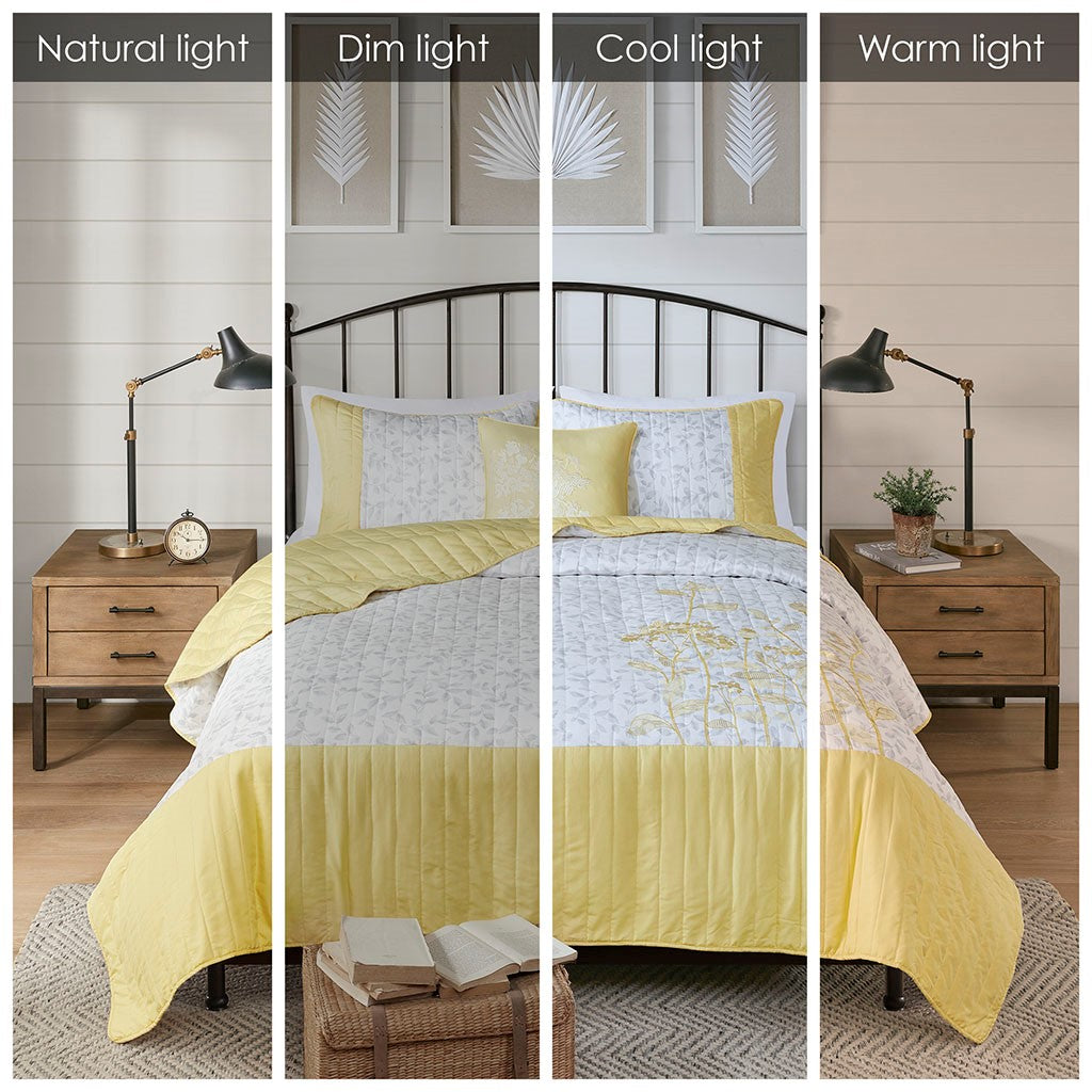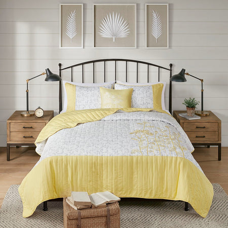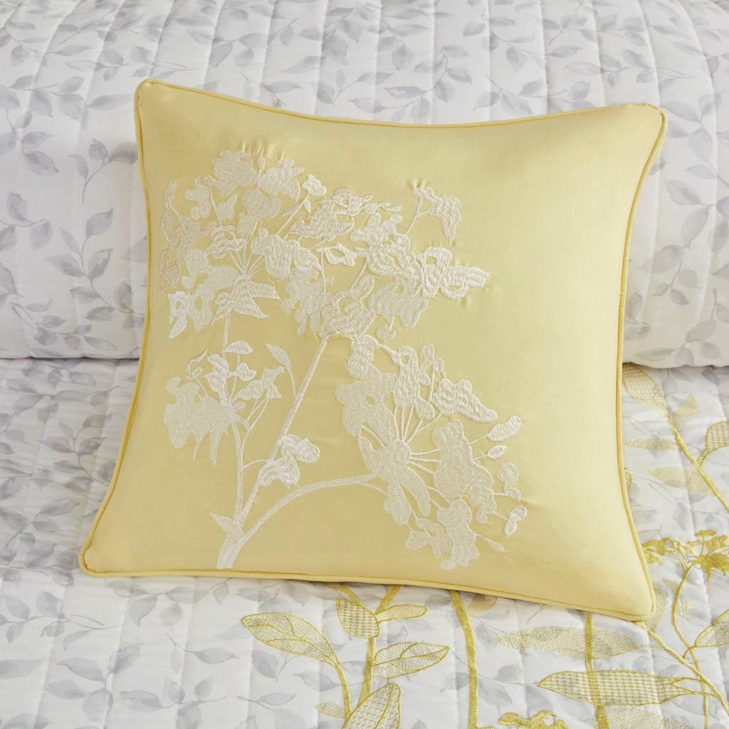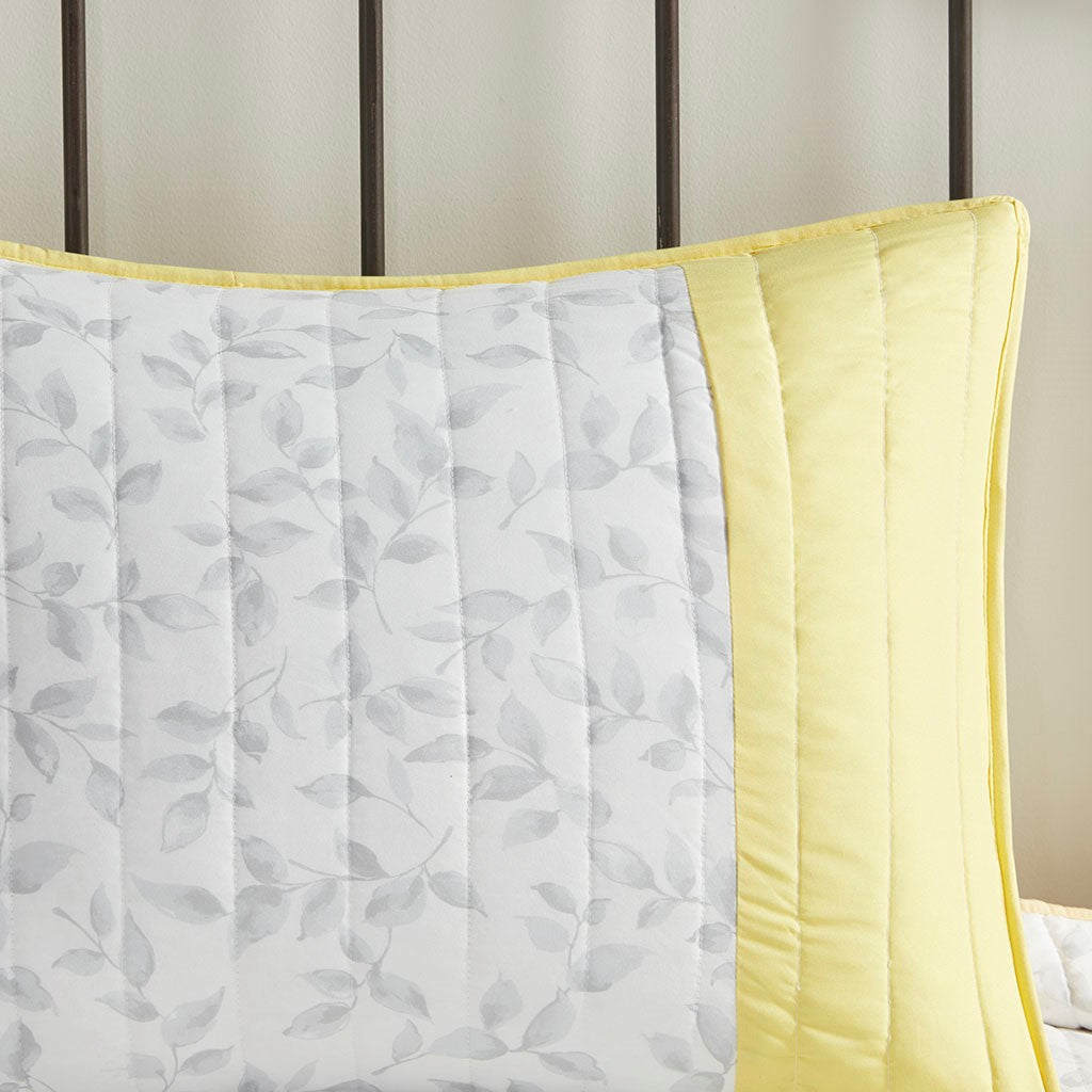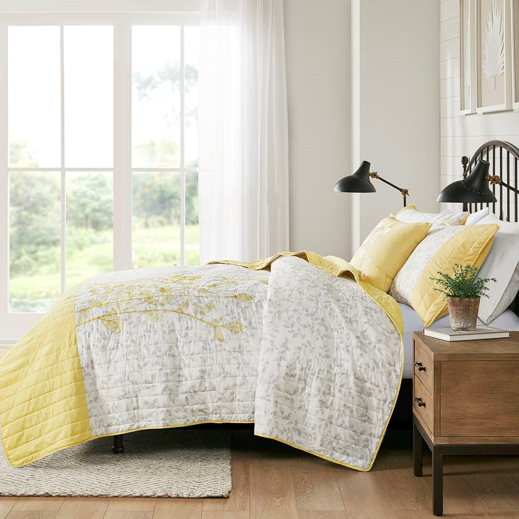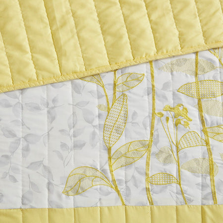 Create a cozy bedroom space with the refreshing charm of Madison Park's Pippa 4 Piece Microfiber Coverlet Set. This soft microfiber coverlet features a gray leaf print with a yellow embroidered floral design, for an elevated transitional look. The solid yellow reverse brings a splash of color to accent the face of the coverlet. Two matching shams repeat the floral pattern, while a coordinating decorative pillow provides a chic finishing touch. Machine washable, this microfiber coverlet set has an antimicrobial treatment that provides built-in freshness protection, inhibits growth of odor causing bacteria, and keeps the fabric newer, longer.