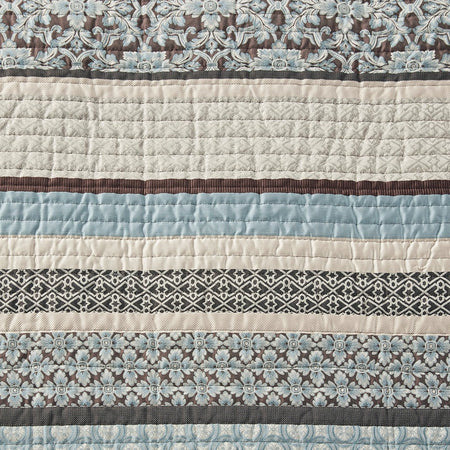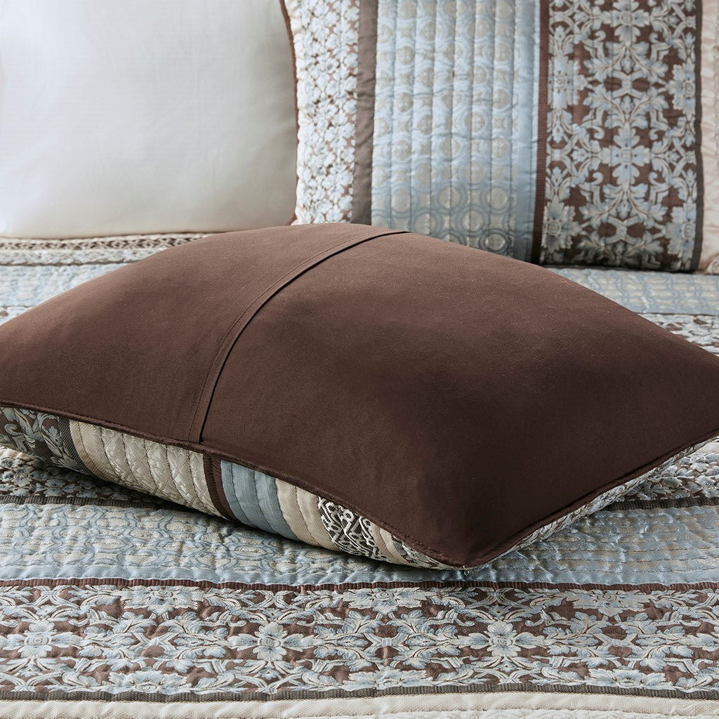 To add a touch of richness to your current decor, the Princeton 5 Piece Reversible Jacquard Coverlet Set can update your room in seconds. Made from polyester jacquard, the coverlet and shams share leaf, striping and medallion motifs that are accentuated by channel stitching on a chocolate brown base. Pops of blue are also used throughout this collection adding a lavish feeling to your decor. Two decorative pillows feature pleating and embroidery details that correspond back to the coverlet to bring this entire look together. Items in the set may come in a rolled or compressed packaging, which will need to be fluffed up or steam ironed before use to remove wrinkles.