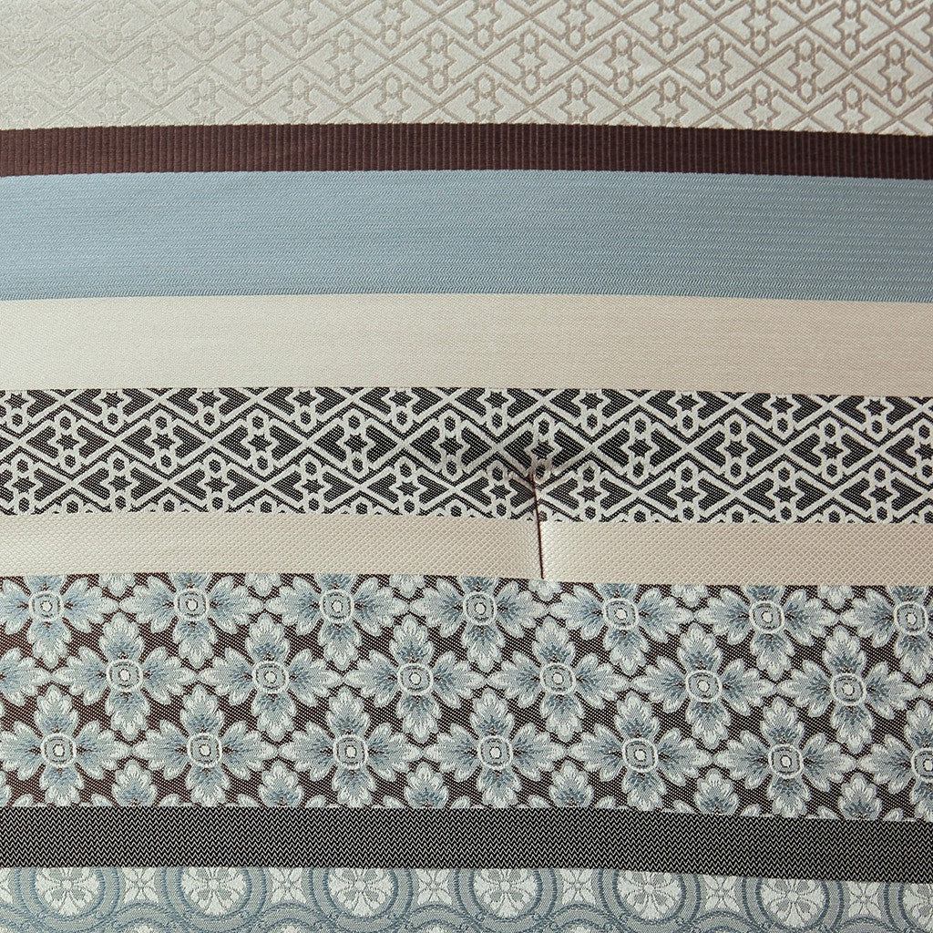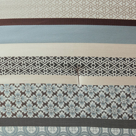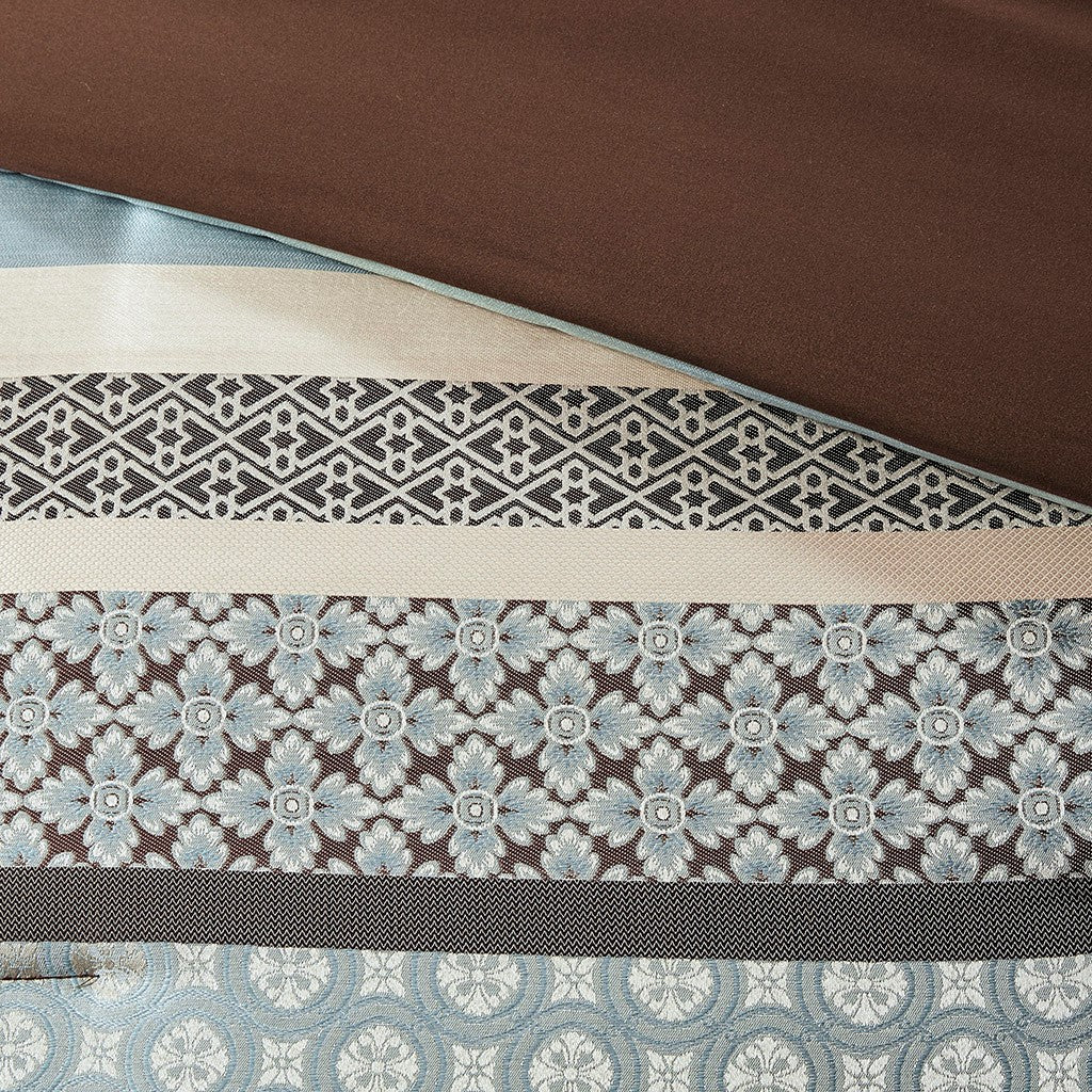 Update your bedroom with the Princeton comforter set. Princeton creates character with intricate geometric and damask prints in a mix of grey, ivory, and soft blue tones. This comforter set includes two king shams and three embroidered decorative pillows in blue, ivory, and brown with embroidery and pieced details that pull the whole look together. Made from polyester jacquard and a brushed fabric reverse this comforter is soft to the touch and is machine washable for easy care.